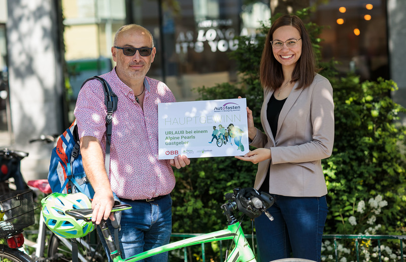 Einer der beiden österreichweiten Hauptgewinne des Autofasten-Gewinnspiels ging diesmal in die Steiermark: Der begeisterte Radfahrer und Auto-Faster Peter Greiner aus Werndorf holte sich seinen Gewinn – einen Wochenendurlaub für zwei Personen in einem Mitgliedsbetrieb des alpenweiten Beherbergungsnetzwerkes von Alpine Pearls inklusive Anreise mit den ÖBB – mit einem seiner, wie er erzählte, „fünf Fahrräder“ bei in Graz ab. Für jede Strecke besitzt er das passende Rad – sogar eines mit Spikes, damit er auch im Winter, wenn es eisig ist, damit fahren kann. Sein Wunsch an die Politik in Punkto Mobilität ist eindeutig: Ein durchdachtes Radwegenetz auch in ländlichen Gebieten!