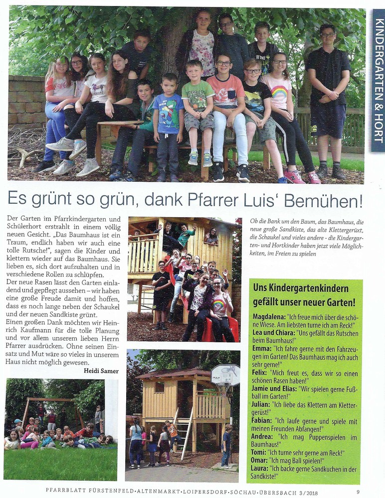 Die Zusammenarbeit mit der Pfarre zeichnet sich vor allem durch den regelmäßigen und sehr guten Kontakt mit unserem Herrn Pfarrer Alois Schlemmer und dem Pastoralassistenten Gerhard Weber aus. Gemeinsam gestalten wir Familienmessen und Krippenspiele, die großen Anklang finden. Außerdem können wir jederzeit Berichte und Ankündigungen in unserem Pfarrblatt veröffentlichen. Besonders erfreulich ist, dass sich immer wieder einige unserer Kinder zum Ministrantendienst bereit erklären.