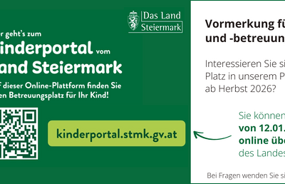 Die Vormerkung für das Kinderbildungs- und -betreuungsjahr 2026/ 2027 im Zeitraum von 12.01. bis 08.02.2026 über das Kinderportal des Land Steiermarks möglich.