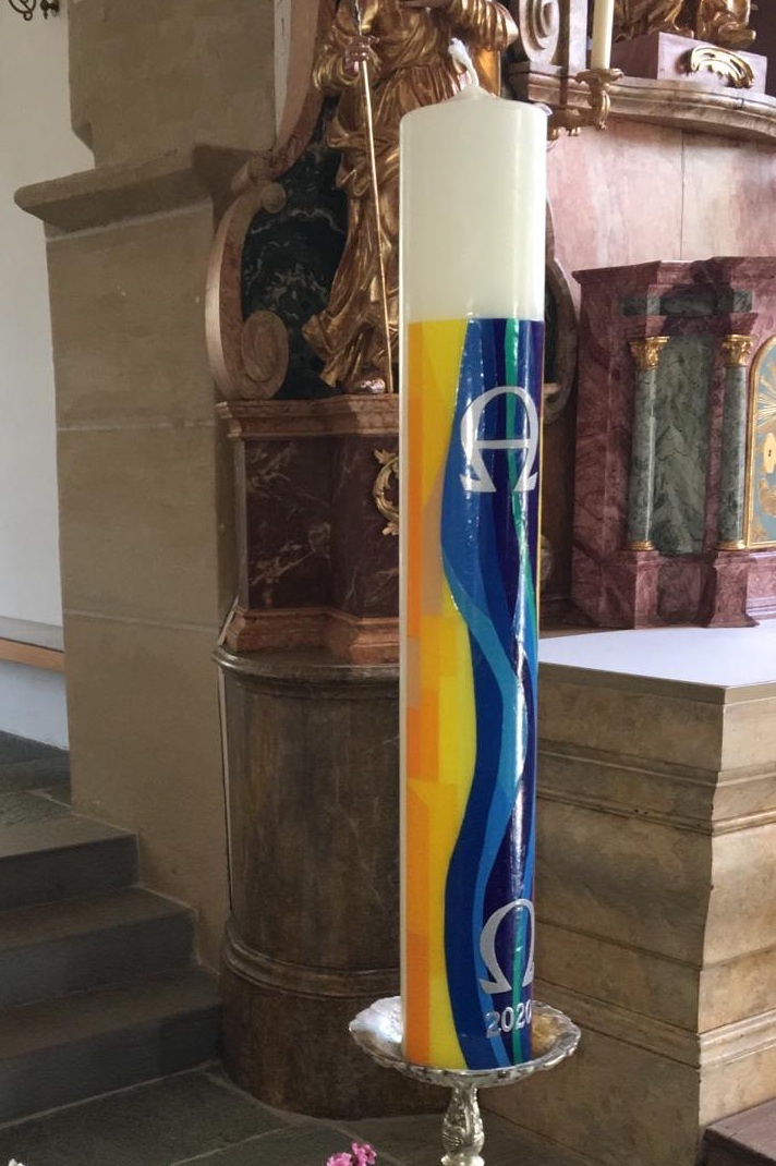 Die Osterkerze in unserer Pfarrkirche wurde – wie jedes Jahr – von Reingard und Claudia Glößl gestaltet. Norbert Glößl schreibt zur Symbolik der Osterkerze 2020: