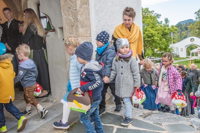 Die Kinder des Pfarrkindergartens zogen feierlich mit einer kleinen Erntekrone in die Kirche ein. Schon Wochen vorher übten sie verschiedene Lieder ein, die sie mit Begeisterung aus voller Kehle sangen. Vertreter der Bauernschaft legten Erntegaben vor dem Altar nieder und für die Bauern berichtete Frau Köppel von den Witterungsbedingungen des abgelaufenen landwirtschaftlichen Jahres, die eine gute Ernte ermöglichten. Sie wies aber auch auf die vielfachen anderen Bereiche unseres Lebens hin, für die wir dankbar sein müssen.