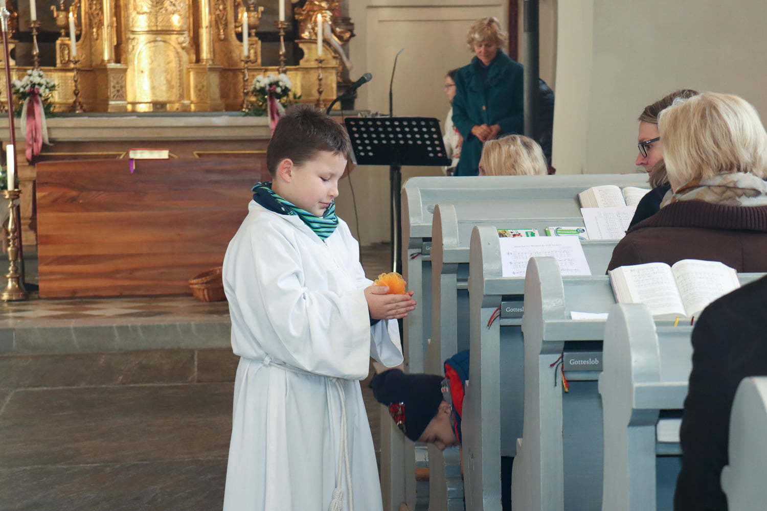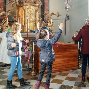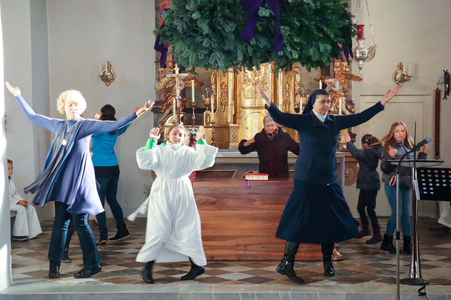 In der Wortgottesfeier ist mehr Raum für neue Elemente. So tanzte Barbara Koren mit einigen Frauen und Kindern den Tanz „Samen der Liebe“. Gebet ist nicht nur reden, singen, still sein … sondern auch mit Leib und Seele, mit dem ganzen Körper meinen Glauben zum Ausdruck zu bringen. Vor dem Segen zeigten die Kinder mit einer symbolischen Handlung – das Aufblühen „einer Blüte“ mit Seidentüchern – was es bedeutet, füreinander zum Segen zu werden.