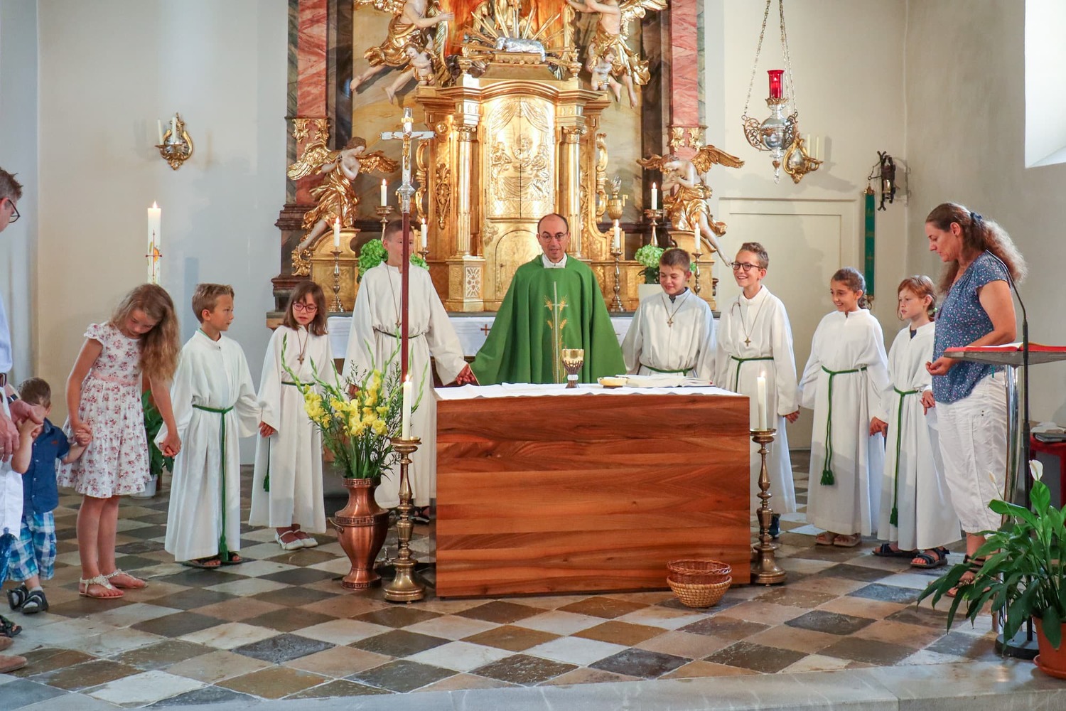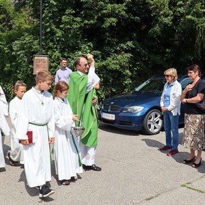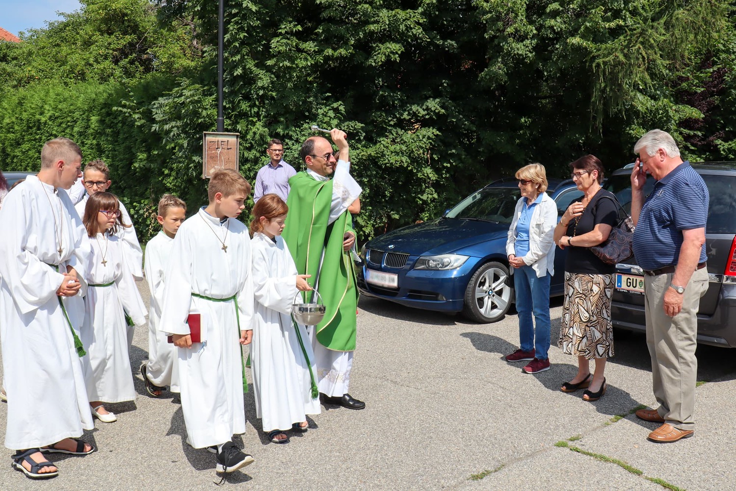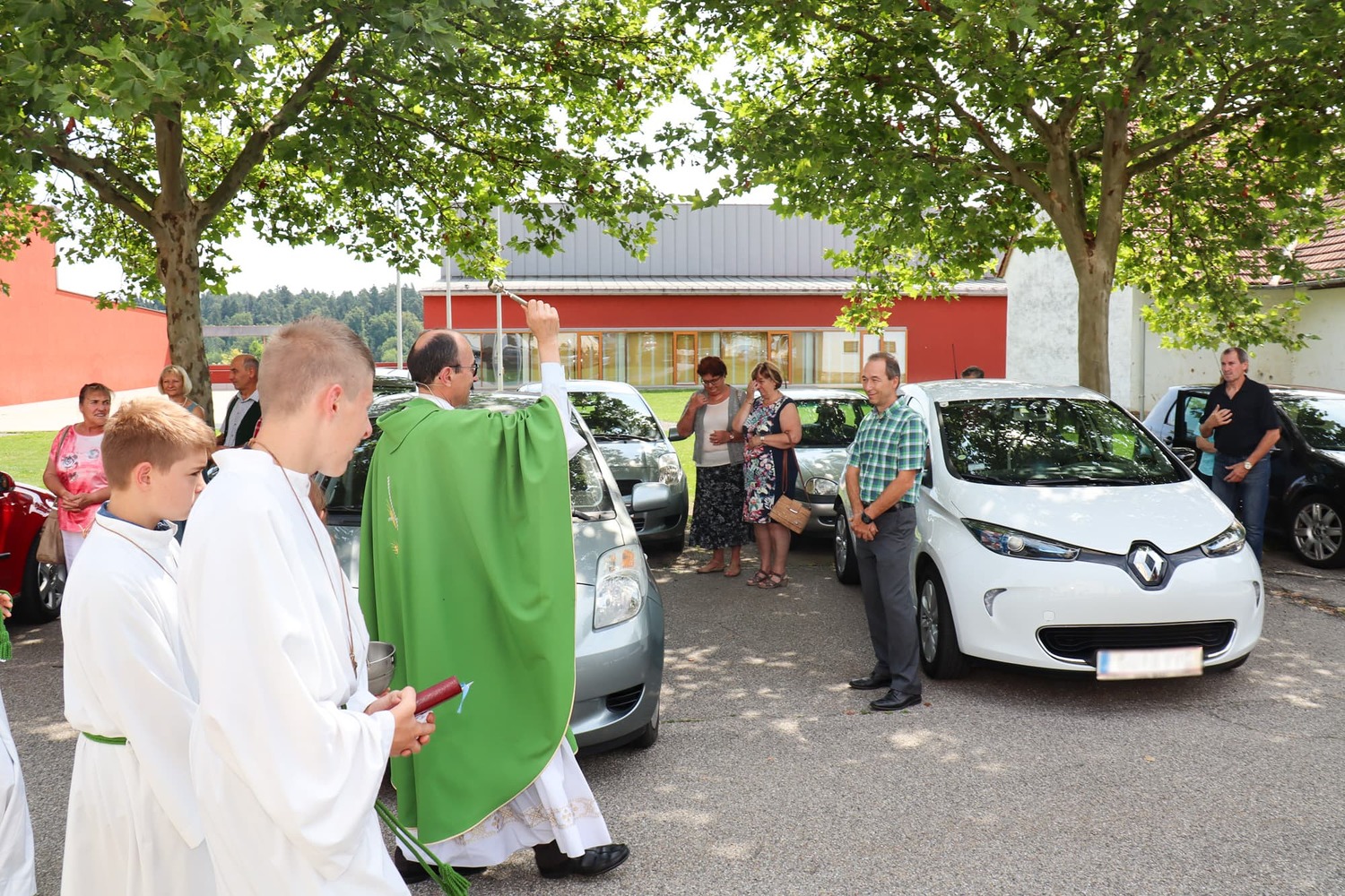 Stilgerecht fuhr Pfarrer Karner mit seinem E-Bike nach Dobl und parkte es neben einem Dreirad hinter der Kirche inmitten der Autos. Nach dem Gottesdienst wurde zur Fahrzeugsegnung eingeladen. Bei allem Fortschritt in der Fahrzeugtechnik begleitet uns im Verkehr doch die Unsicherheit vor unseren eigenen Fahrfehlern und dem Fehlverhalten der anderen Verkehrsteilnehmer. So meinte ein Fahrzeugbesitzer, der zur Segnung seines Autos gekommen war, die Verantwortung als Lenker ist heute fast zu schwer.