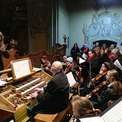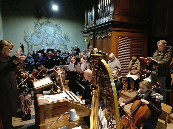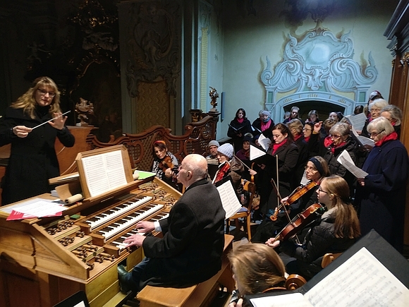 Als Hauptwerk des Adventkonzerts stand das stimmungsvolle Weihnachtsoratorium von Camille Saint-Saens am Programm, das wegen seiner besonderen Besetzung auf der Orgelempore musiziert wurde: Fünf Solisten und der Chor tragen darin die Weihnachtsgeschichte in lateinischer Sprache vor, begleitet von der großen Orgel, einer Harfe und Streichorchester. Zur besinnlichen Einstimmung auf die Adventzeit sang der Chor davor am Hochaltar A-Cappella-Motetten von Johannes Brahms, Benjamin Britten und Morten Lauridsen.