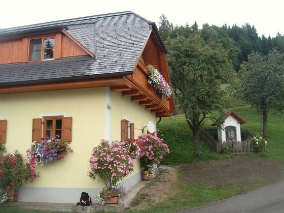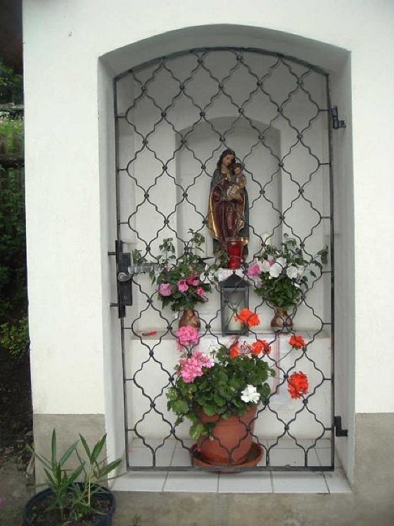 In 750 m Seehöhe liegt am Laufnitzberg der Bauernhof der Familie Karl Schneller jun. vulgo Egger – das Heimathaus der beiden fleißigen Pfarrmitarbeiterinnen Maria und Elisabeth Schneller, die dort geboren wurden und gemeinsam mit sieben weiteren Geschwistern ihre Jugendzeit verbrachten. Dieser Hof wurde bereits vor über 500 Jahren urkundlich erwähnt als „Dy Hofstatt auf dem Eckh“. Im Jahr 1929 übernahmen die Großeltern des heutigen Besitzers, Kreszentia und Karl Schneller, den „Eggerhof“ auf Leibrente. Als Kreszentia Schneller im Jahr 1994 von einer schweren Krankheit genas, beschlossen die Hoferben, Johanna und Karl Schneller sen., als Zeichen der Dankbarkeit neben ihrem gepflegten Wohnhaus im Obstgarten einen Bildstock zu errichten, an dessen Anblick sich Mutter Kreszentia noch drei Jahre erfreuen durfte. Auch der unerklärliche Umsturz eines Kreuzes hinter dem Haus, bei dem früher die Kreuzwegandacht am Laufnitzberg begonnen hatte, wurde als Wink von „oben“ zum Bau eines neuen Glaubenszeichens gedeutet.