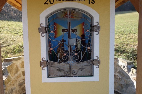 Die Grundplatte ist betoniert, der Sockel und die Hangstützmauer wurden mit Steinen aus dem Pöllagraben gebaut. Den Bildstock selbst führte Karl Wieser mit Ziegelmauern aus. Johannes Fuchsbichler errichtete die Holzkonstruktion mit einem doppelt gedeckten Schindeldach und einem Vordach. Die im Zentrum befindliche Mauernische wurde vom befreundeten Grazer Künstler Walter Prettenthaler wunderschön gestaltet. In der Mitte sieht man den Kreuzigungshügel Golgotha außerhalb Jerusalems, über dem eine Taube in einer Wolke als Zeichen der Auferstehung dient, auf der linken Innenseite den heiligen Hubertus, den Patron der Jäger (Gedenktag: 3. November), und auf der rechten Innenseite den heiligen Leonhard, den Schutzpatron der Bauern und des Viehs (Gedenktag: 6. November). Das schmiedeeiserne Gitter mit einem Schloss wurde von Alfred Zöhrer vlg. Hoyer kunstvoll angefertigt.