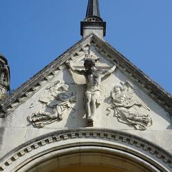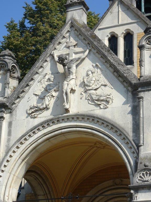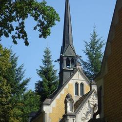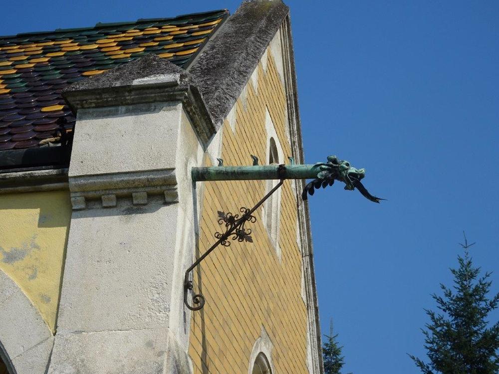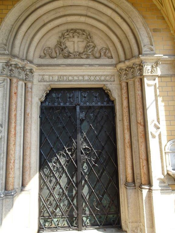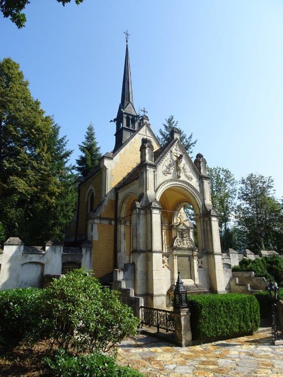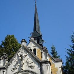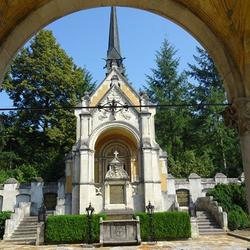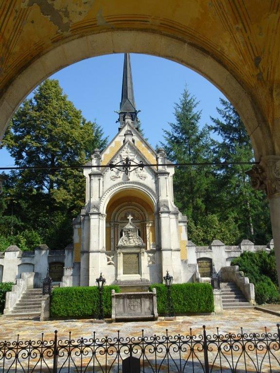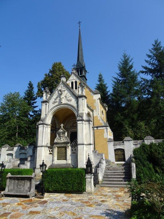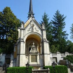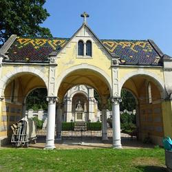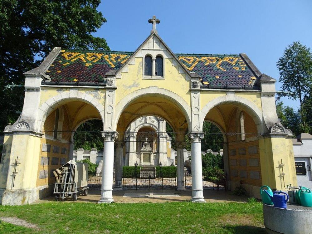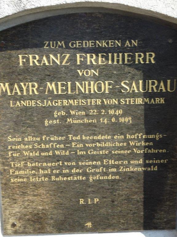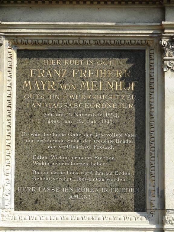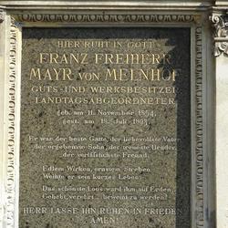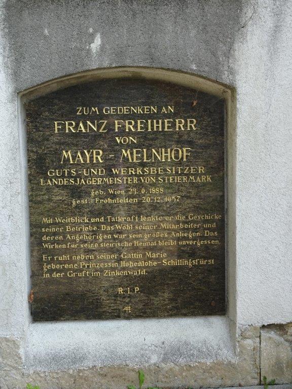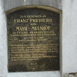 Die 1898 fertig gestellte Grabkapelle zählt wohl zu den schönsten Grabmonumenten und befindet sich am Areal der Mayr-Melnhof`schen Familiengruft im östlichen Bereich des Ortsfriedhofs in Adriach. Dieses für die Gruft und den neuen Friedhof der Pfarre Frohnleiten benötigte Grundstück hatte Freiherr Franz Mayr von Melnhof der Gemeinde gestiftet. Auftraggeber der Gruft war Franz III. Freiherr Mayr von Melnhof (1854 – 1893), Guts- und Werksbesitzer, Gründer der heutigen Kartonfabrik in Frohnleiten und Landtagsabgeordneter. Nach seinem frühen Tod 1893 wurde er als Erster der Familie darin beigesetzt. Dieses schöne Zeichen des Glaubens befindet sich am hinteren Ende des mit Zinnen bewehrten, ummauerten Bereichs und ist über flache Freitreppen erreichbar. Die Kapelle besteht im Kern aus einem einfachen Baukörper mit quadratischem Grundriss und Pultdach. Die Mauern sind mit ockerfarbenen Tonfliesen aus den Wienerberger Ziegelwerken verkleidet. Das Dach ist von einem hohen Dachreiter bekrönt, einem Aufbau aus Metall, der mit einer Glocke ausgestattet und mit auffälligen glasierten Ziegeln gedeckt ist. Dem Eingang der Kapelle ist eine niedrigere, steinsichtige Vorhalle vorgesetzt, die sich nach drei Seiten in runden Bögen öffnet. In die Brüstung ihrer Stirnseite ist eine wappenbekrönte Tafel eingelassen, die mit rührenden Worten an den verstorbenen Erbauer erinnert: „Das schönste Los ward ihm auf Erden, Im Giebelfeld der Grabkapelle prangt eine Skulptur des gekreuzigten Christus, flankiert von Engeln. Mit dem spitzen Türmchen und den hohen Giebeln, dem reichen Skulpturenschmuck bis hin zu den monsterhaften Wasserspeiern erinnert das Bauwerk an die Architektur der Gotik. Der Zugang erfolgt durch die Priestergruft, eine aufwändige Säulenhalle mit drei großen Bögen. Dort fanden die in Frohnleiten verstorbenen Servitenpatres und der verdienstvolle Obmann des „Vereins der Freunde der Kirche Adriach“, OSTR Msgr. Johannes Parizek (1915 – 1996), ihre letzte Ruhestätte. Johann Melinz |