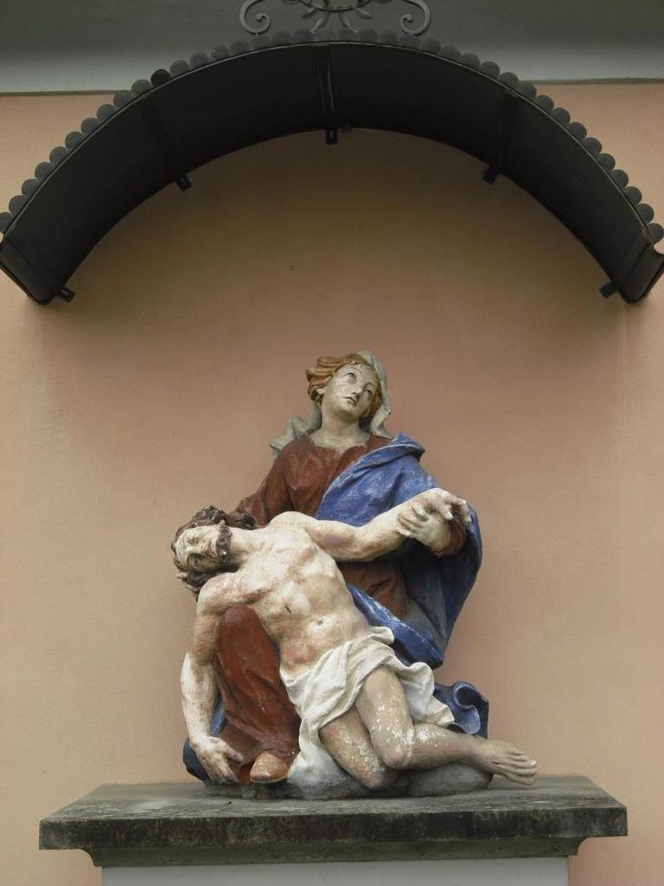 Die Pietastatue ist jährlich am ersten Bitttag Ausgangspunkt für die Bittprozession, die über den Franziskusbrunnen und die Mariensäule zur Pfarrkirche führt.