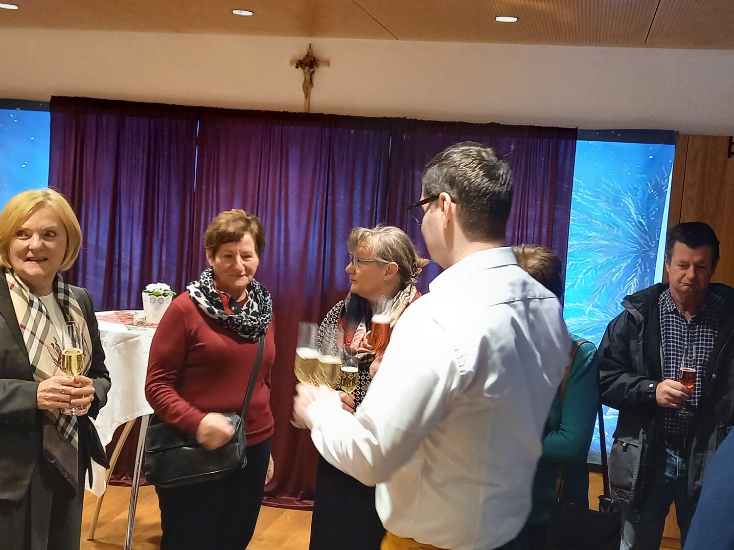 Gleich zur Begrüßung wurde mit einem Gläschen Sekt auf die gute Zusammenarbeit angestoßen und bei einer stimmungsvollen steirischen Hintergrundmusik ließ es sich gleich angeregt plaudern. Pfarrer Schneeflock betonte in seiner Ansprache, wie wichtig "JEDER, JEMAND UND IRGENDJEMAND" ist und bemühte sich, alle Anwesenden namentlich hervor zu heben.