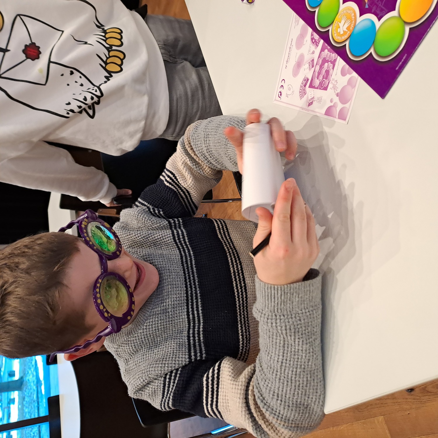 Auch Pfarrer Mag. Robert Schneeflock besuchte unser kleines Event und bewunderte die verrückte Brille vom Spiel "Verblickt", durch die sämtliche Konturen verschwimmen.