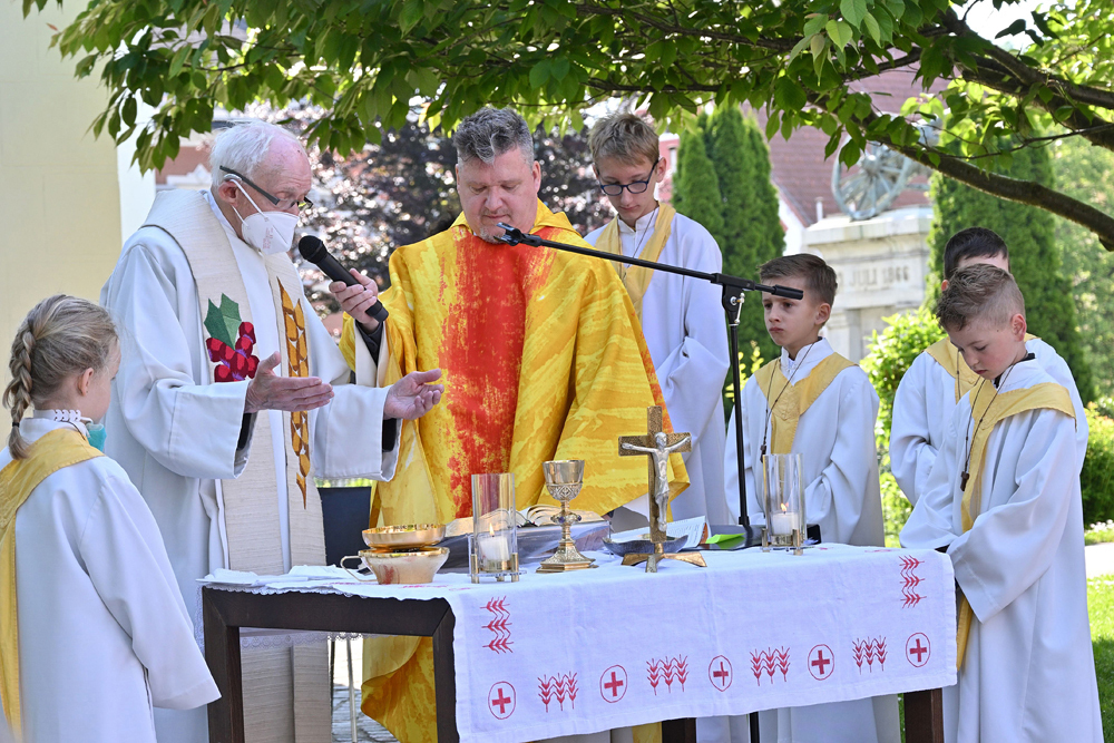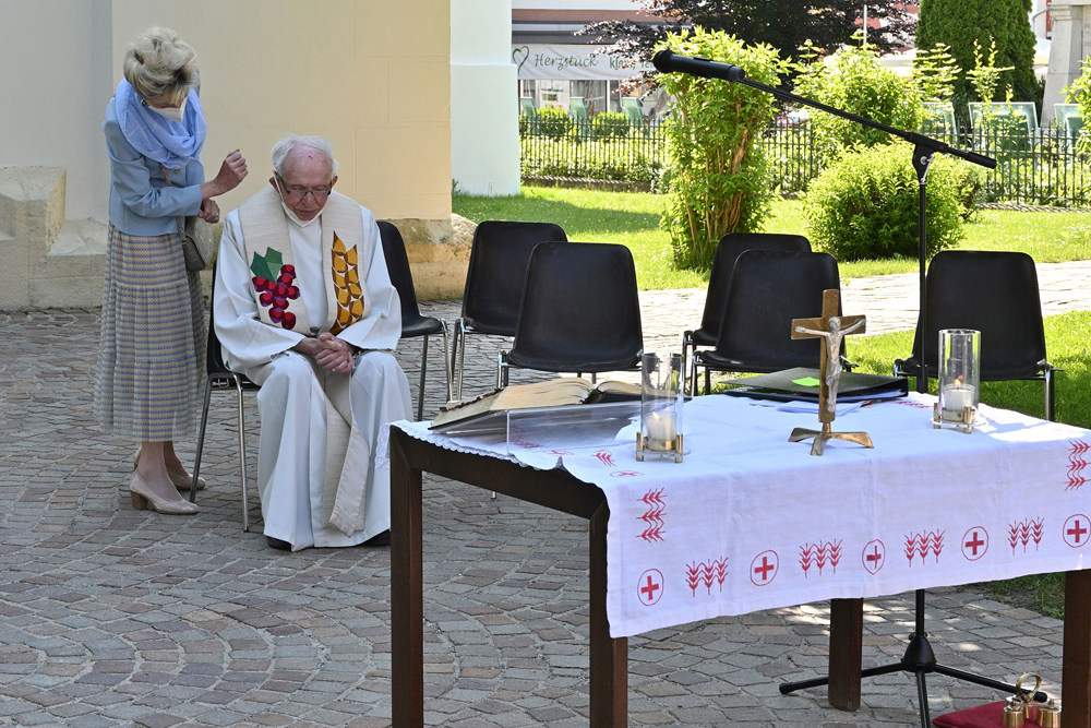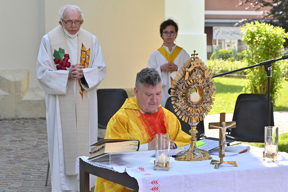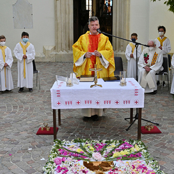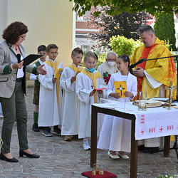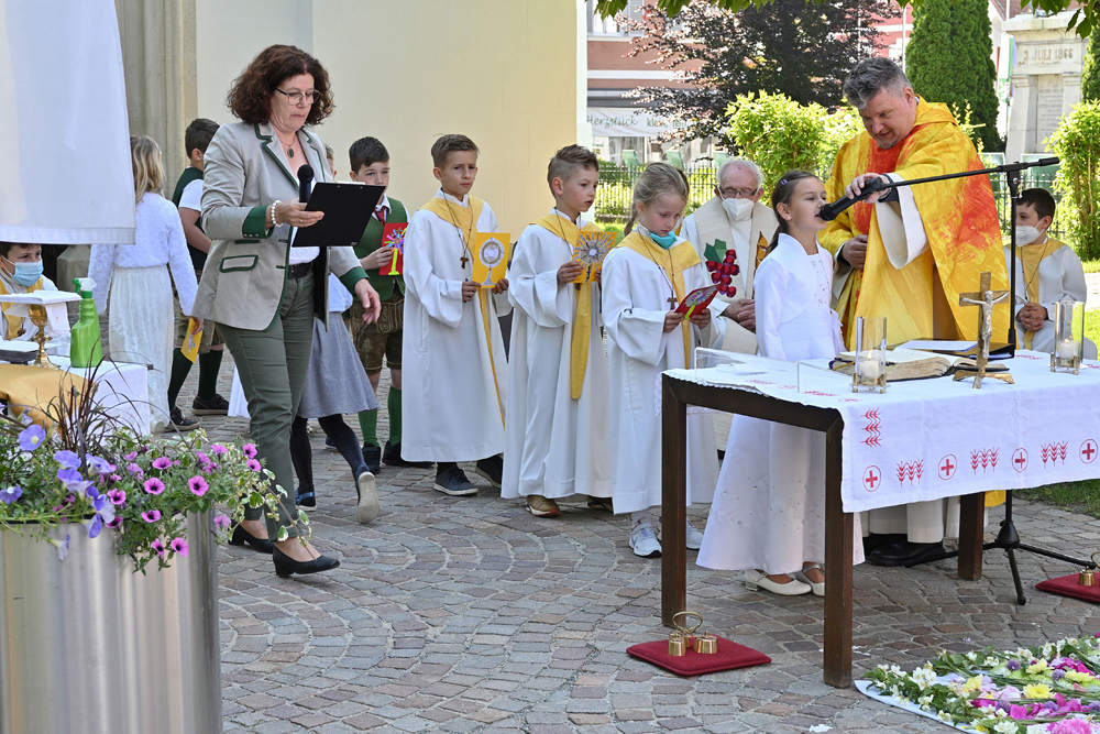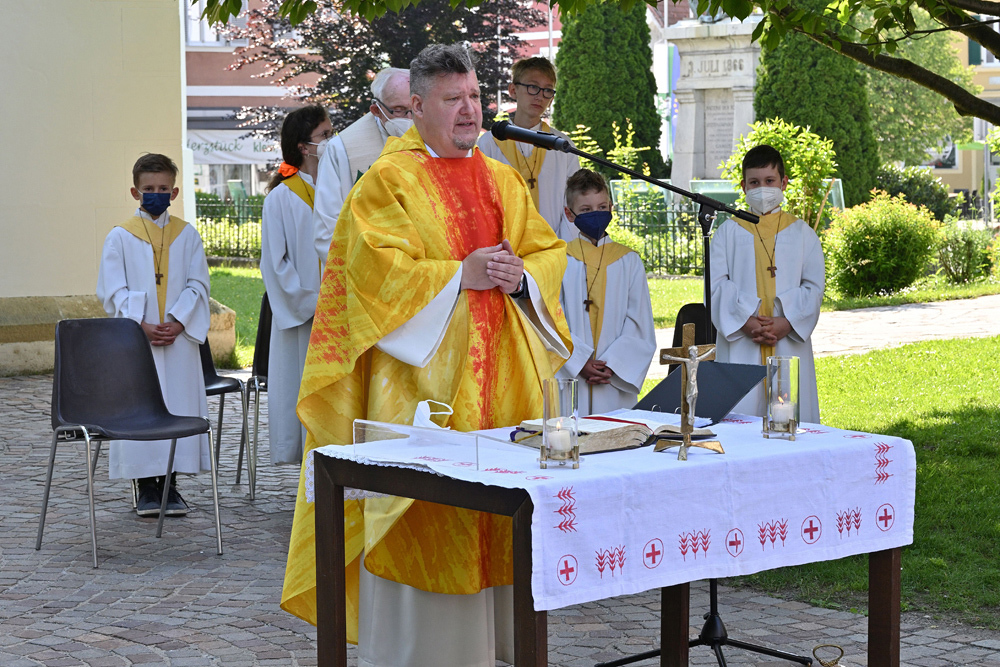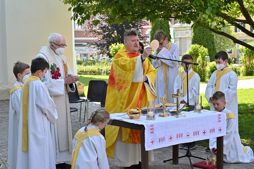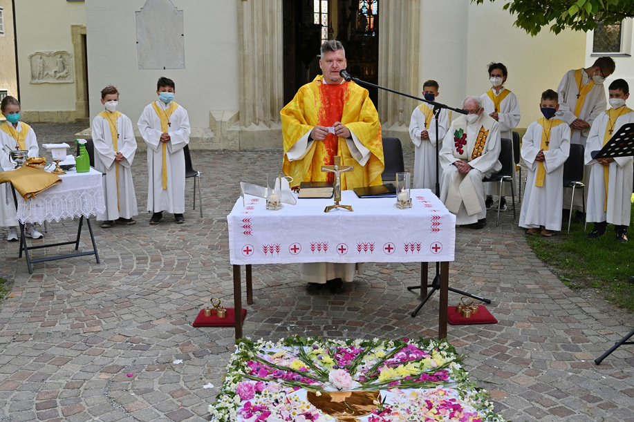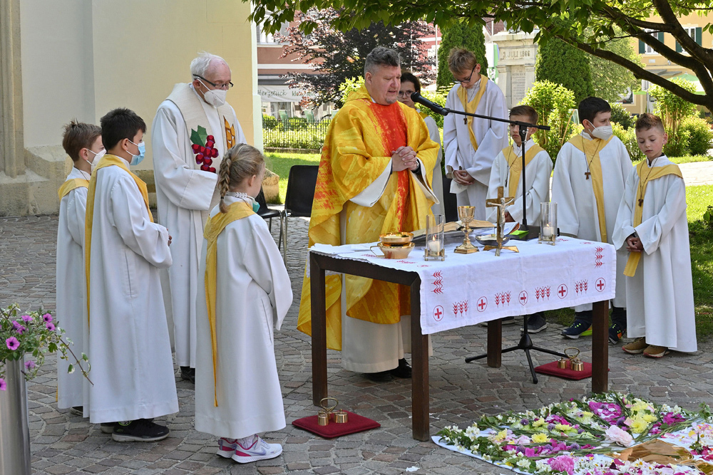 Das „Hochfest des Leibes und Blutes Christi“ feierte die Pfarr­gemeinde Gamlitz auf dem Kirch­platz bei herrl­ichem Wetter. – Pfarrer Robert Schnee­flock erläu­terte das Geheim­nis des Fron­leich­nam­festes aus­gehend von einem An­spruch unserer Zeit, nämlich (immer) alles geben zu müssen: Jesus gab alles - seinen Leib und sein Blut - am Kreuz für unsere Erlösung hin. – Für den Blumen­schmuck vor dem Altar und die fröh­lichen Lieder wäh­rend der Messe (Gitarre: Christina Riegel­negg) sorgten Erst­kom­munion­kinder unter Rel.-Lehrerin Monika Pein. Der Kirchen­chor und das Bläser­ensemble der Markt­musik Gamlitz ergänzten die musika­lische Um­rahmung. – Pfarrer Schnee­flock spendete den Eucharis­tischen Segen auf dem Kirch­platz, eine Prozession mit dem Aller­heiligsten durch den Ort entfiel Corona-bedingt. (Robert Glück, 05.06.2021)