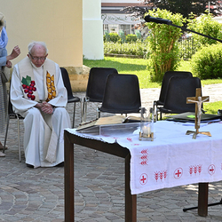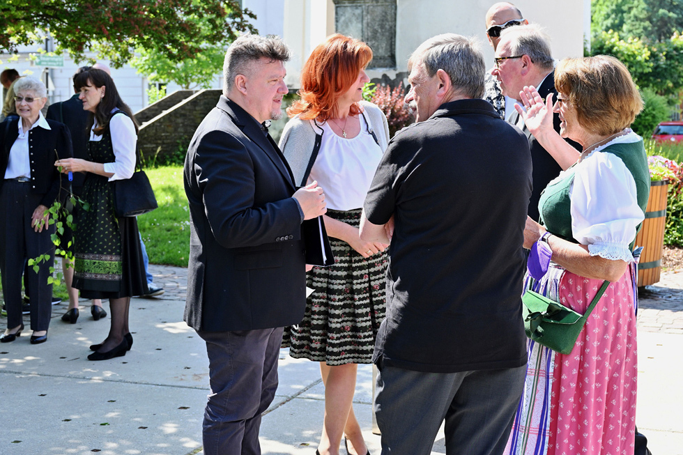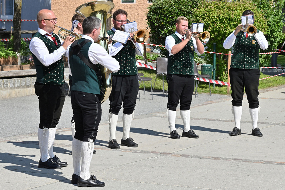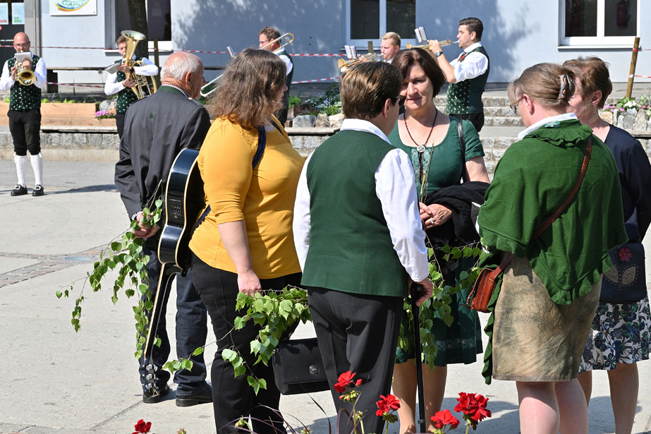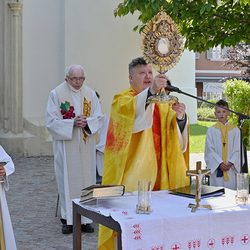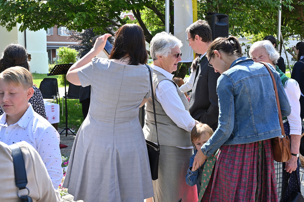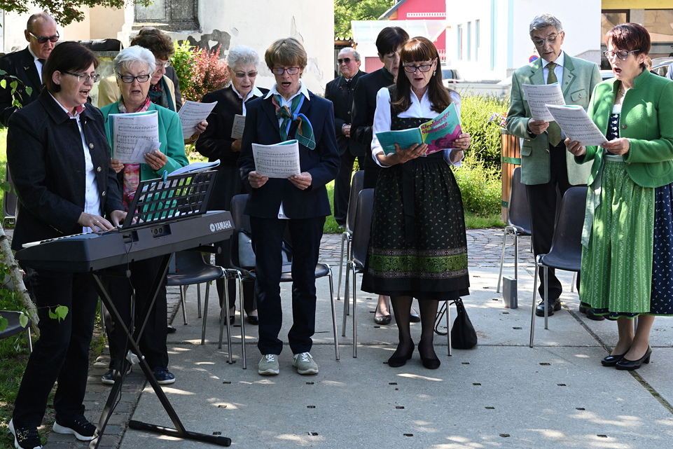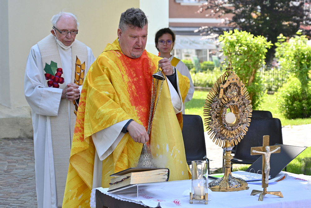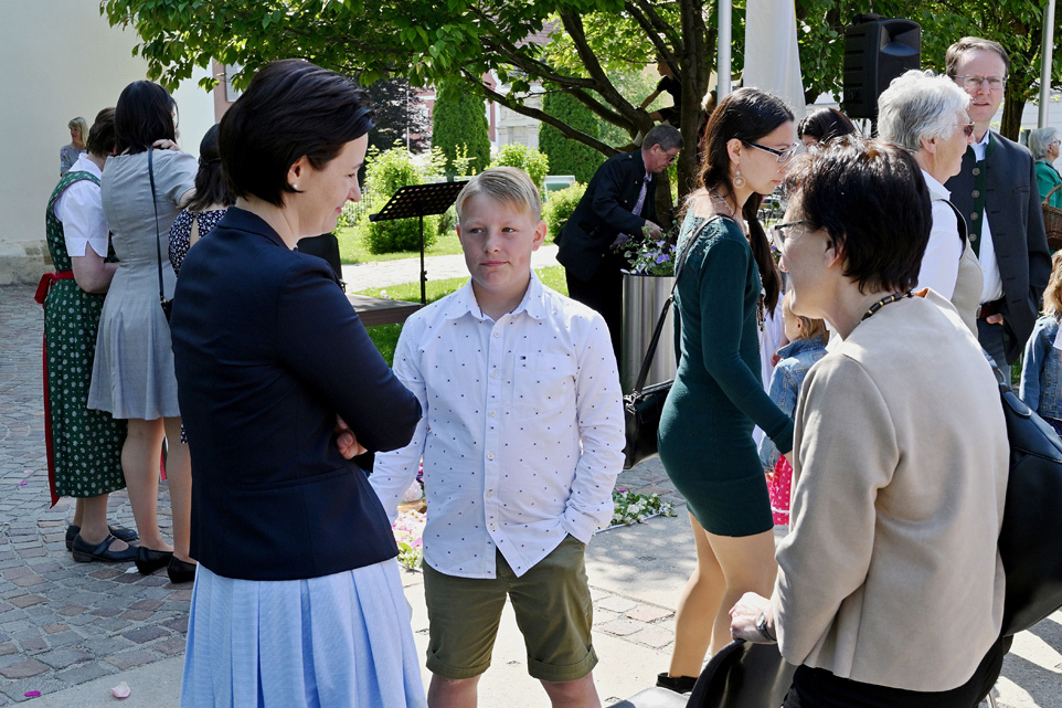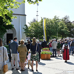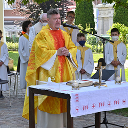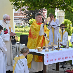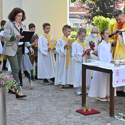 Das „Hochfest des Leibes und Blutes Christi“ feierte die Pfarr­gemeinde Gamlitz auf dem Kirch­platz bei herrl­ichem Wetter. – Pfarrer Robert Schnee­flock erläu­terte das Geheim­nis des Fron­leich­nam­festes aus­gehend von einem An­spruch unserer Zeit, nämlich (immer) alles geben zu müssen: Jesus gab alles - seinen Leib und sein Blut - am Kreuz für unsere Erlösung hin. – Für den Blumen­schmuck vor dem Altar und die fröh­lichen Lieder wäh­rend der Messe (Gitarre: Christina Riegel­negg) sorgten Erst­kom­munion­kinder unter Rel.-Lehrerin Monika Pein. Der Kirchen­chor und das Bläser­ensemble der Markt­musik Gamlitz ergänzten die musika­lische Um­rahmung. – Pfarrer Schnee­flock spendete den Eucharis­tischen Segen auf dem Kirch­platz, eine Prozession mit dem Aller­heiligsten durch den Ort entfiel Corona-bedingt. (Robert Glück, 05.06.2021)