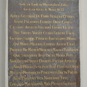 In den südwestlichen Mittelschiffpfeiler ist die Grabplatte für den 1633 verstorbenen Giovanni Pietro de Pomis eingelassen. Das angegebene Geburtsdatum 1565 wird heute in der Forschung eher auf 1569 verlegt. Die Platte weist auf das im Boden befindliche Grab des Malers des Gnadenbildes hin, dem hier an prominenter Stelle der Kirche ein Denkmal gesetzt ist.