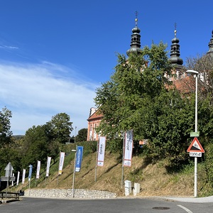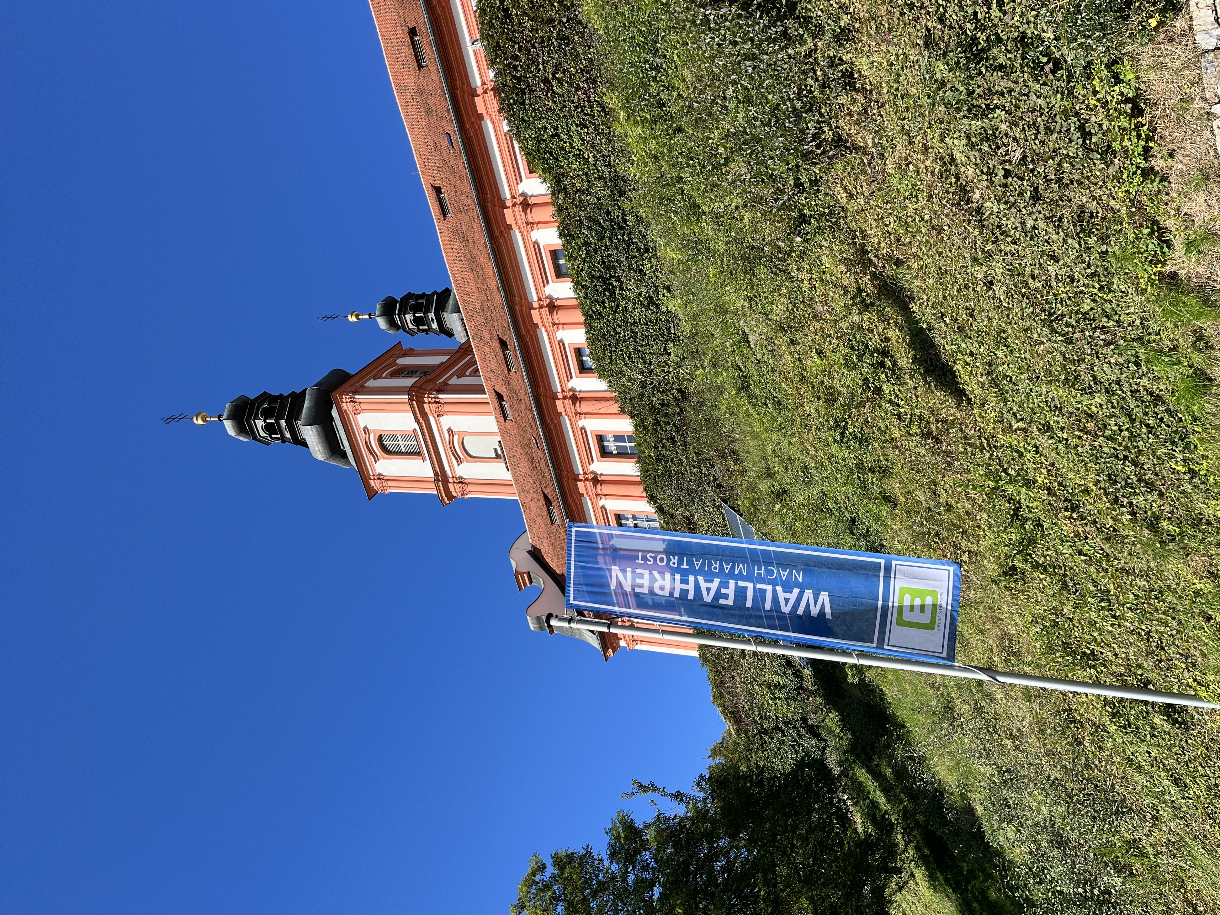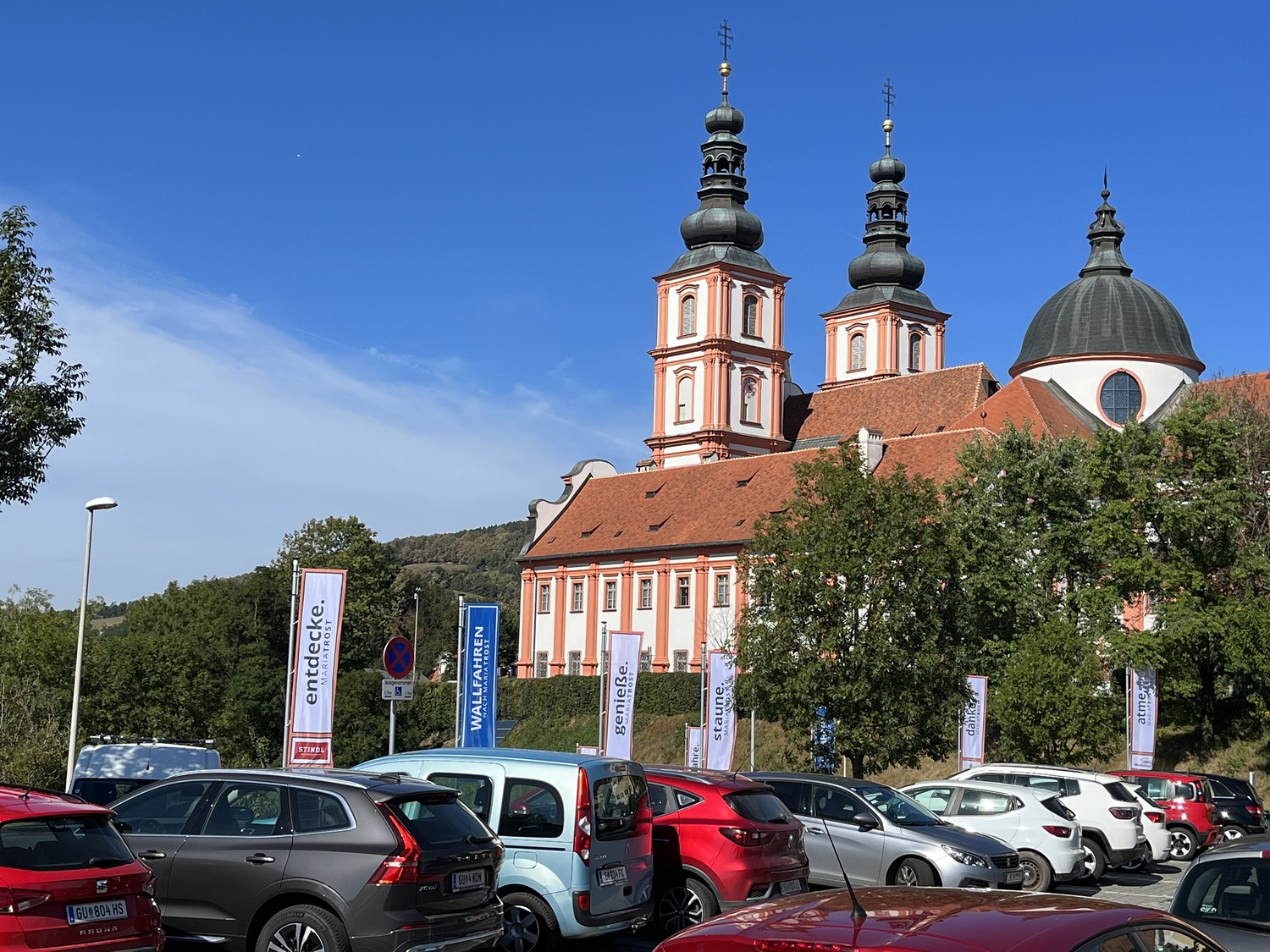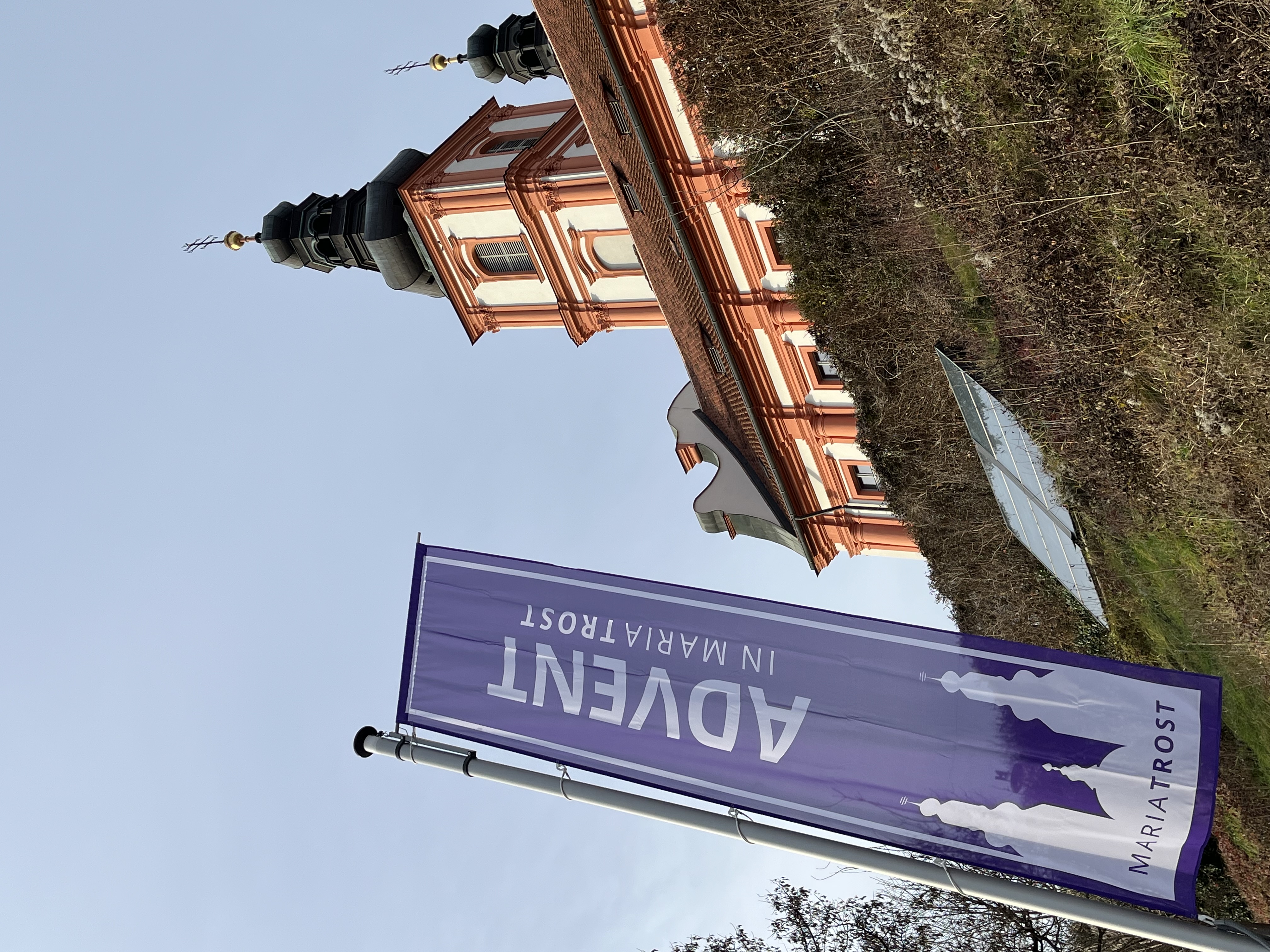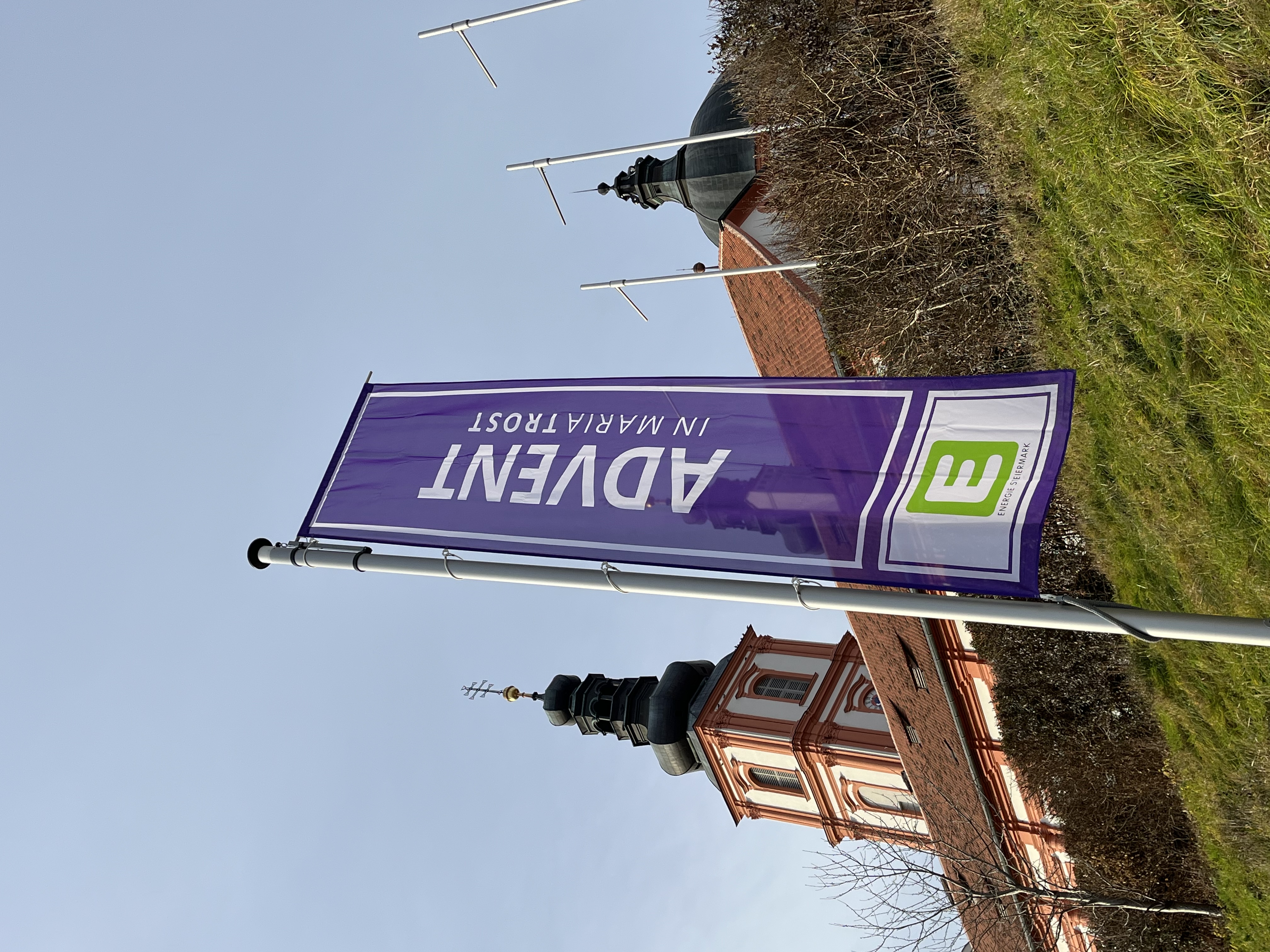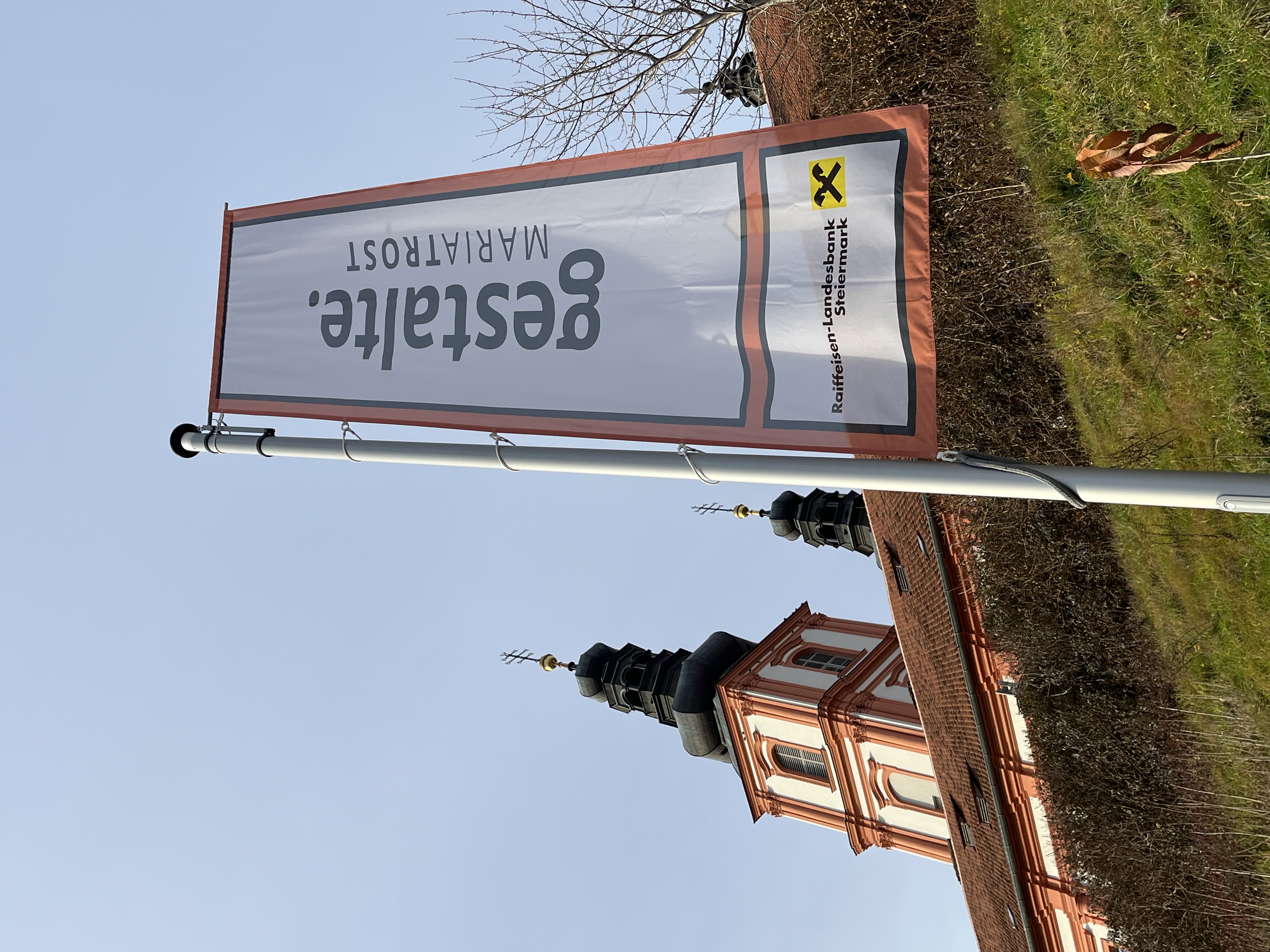 Mit einem Gedankenimpuls laden die Fahnen die Besuchenden zu einem vielfältigen Erleben von MARIATROST ein.