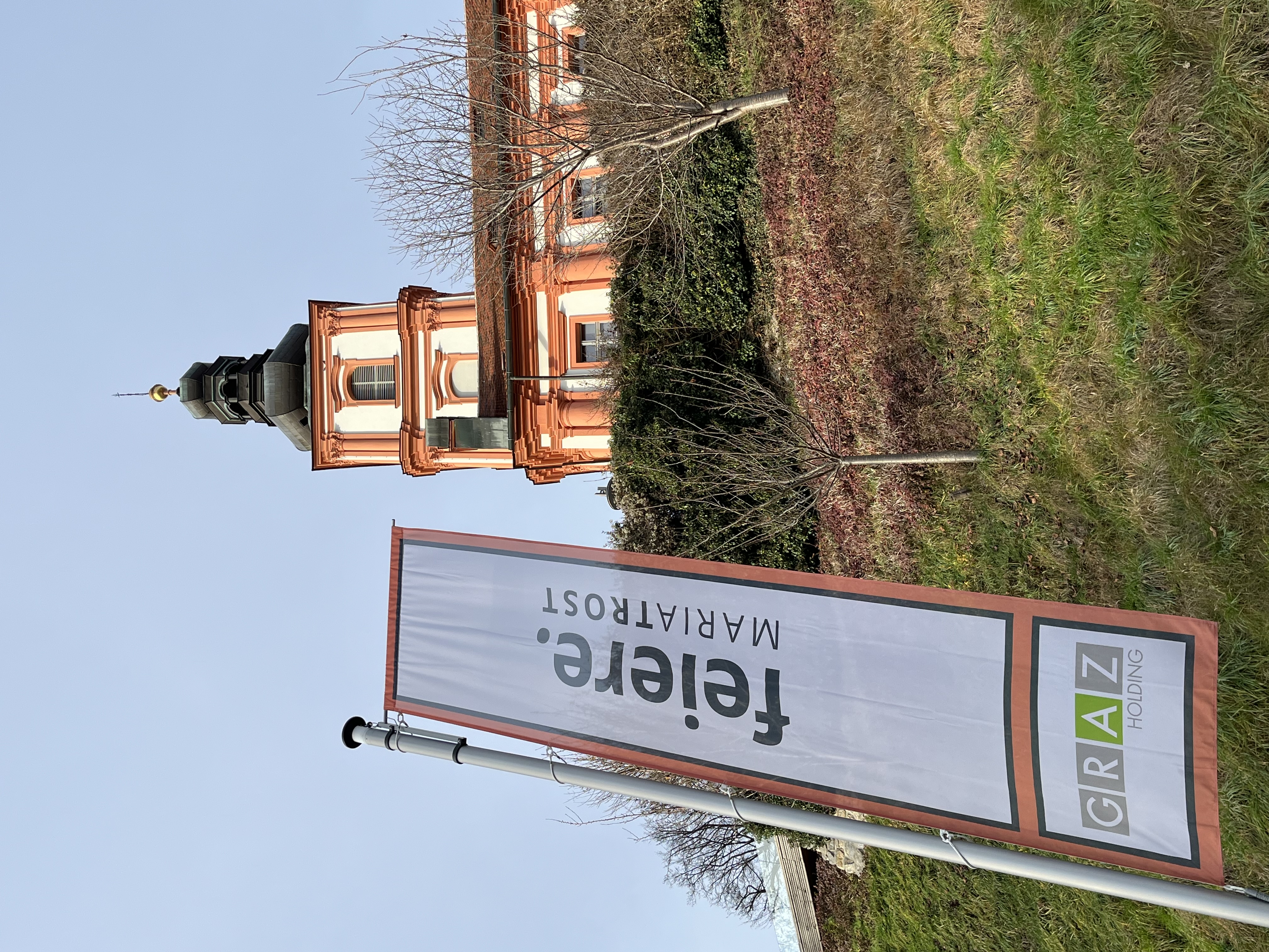 Da flattert etwa: „entdecke MARIATROST“, „gestalte MARIATROST“, genieße MARIATROST“. – Im Rahmen einer Feier mit Sponsoren, Pfarraktiven und Freunden segnete Diözesanbischof Wilhelm Krautwaschl die Fahnen und wünschte viel Gelingen für die weiteren Schritte des für die steirische Kirche wichtigen Projektes.