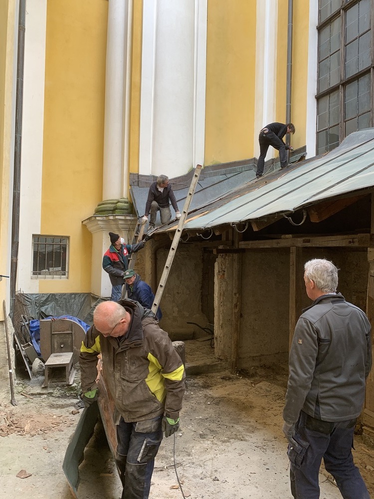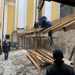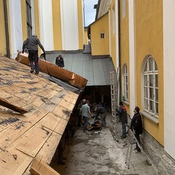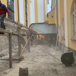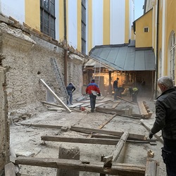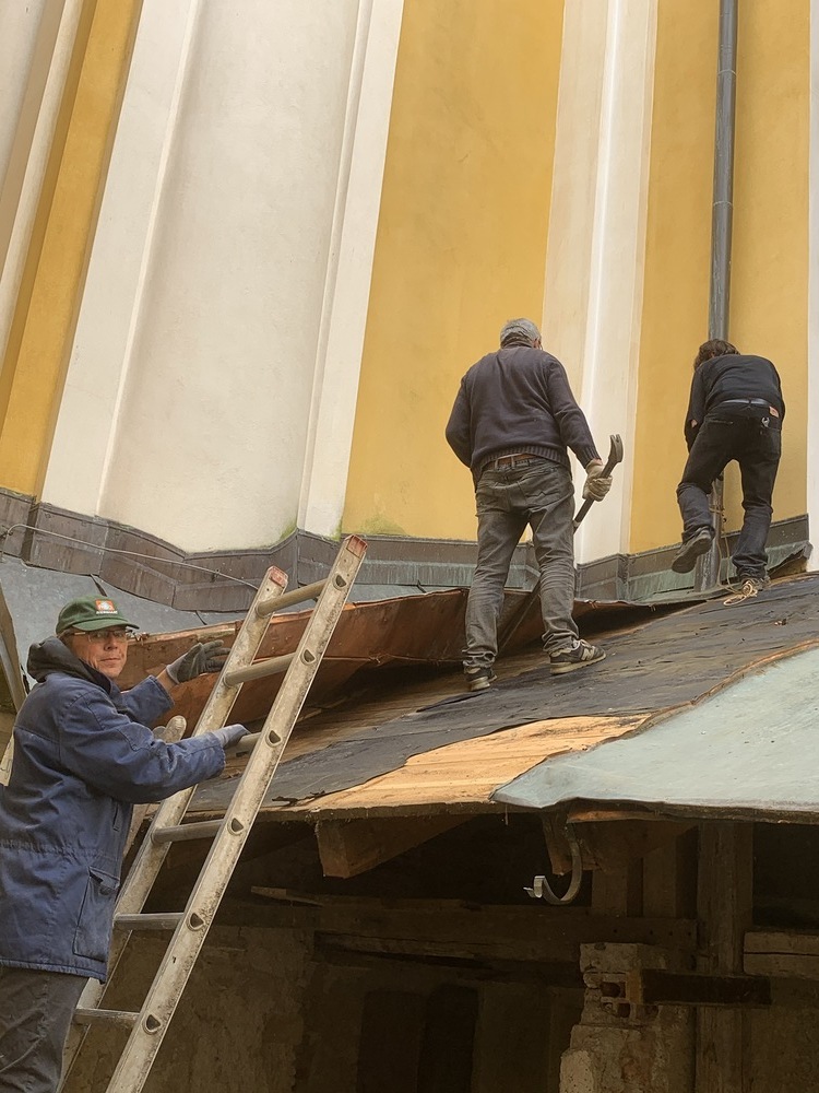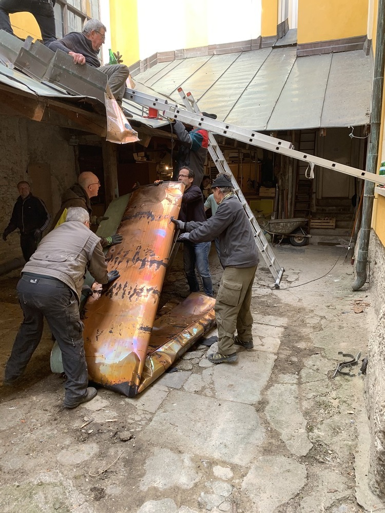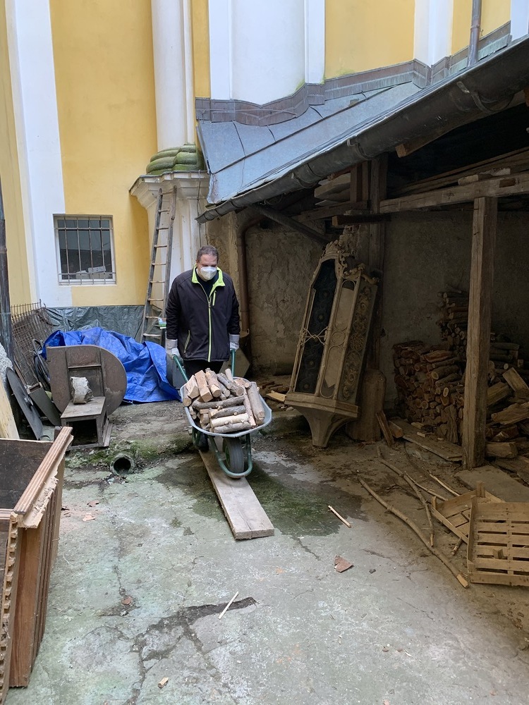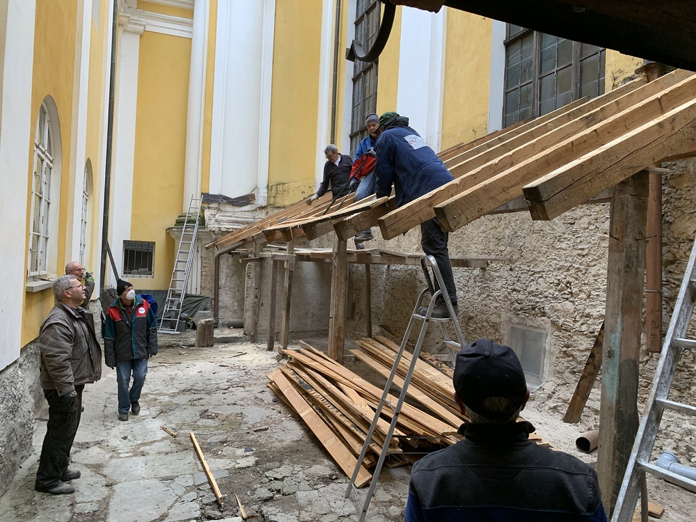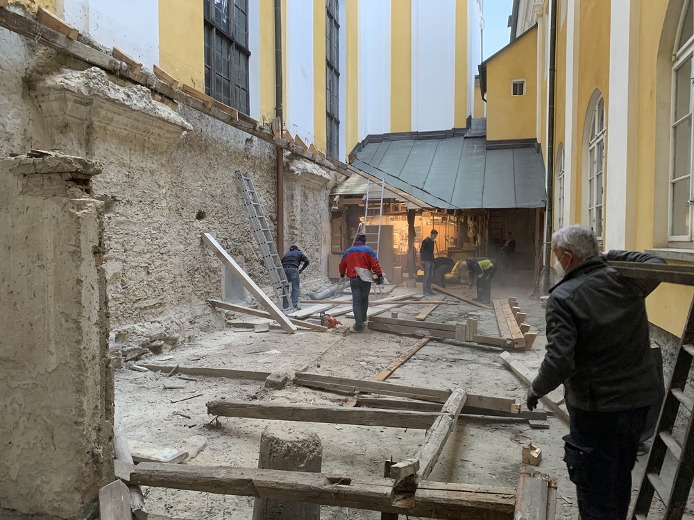 Für die Dach- und Fassadenrestaurierung mußte am Freitag, 12.03.2021 die Holzhütte im Innenhof ausgeräumt und abgetragen werden.