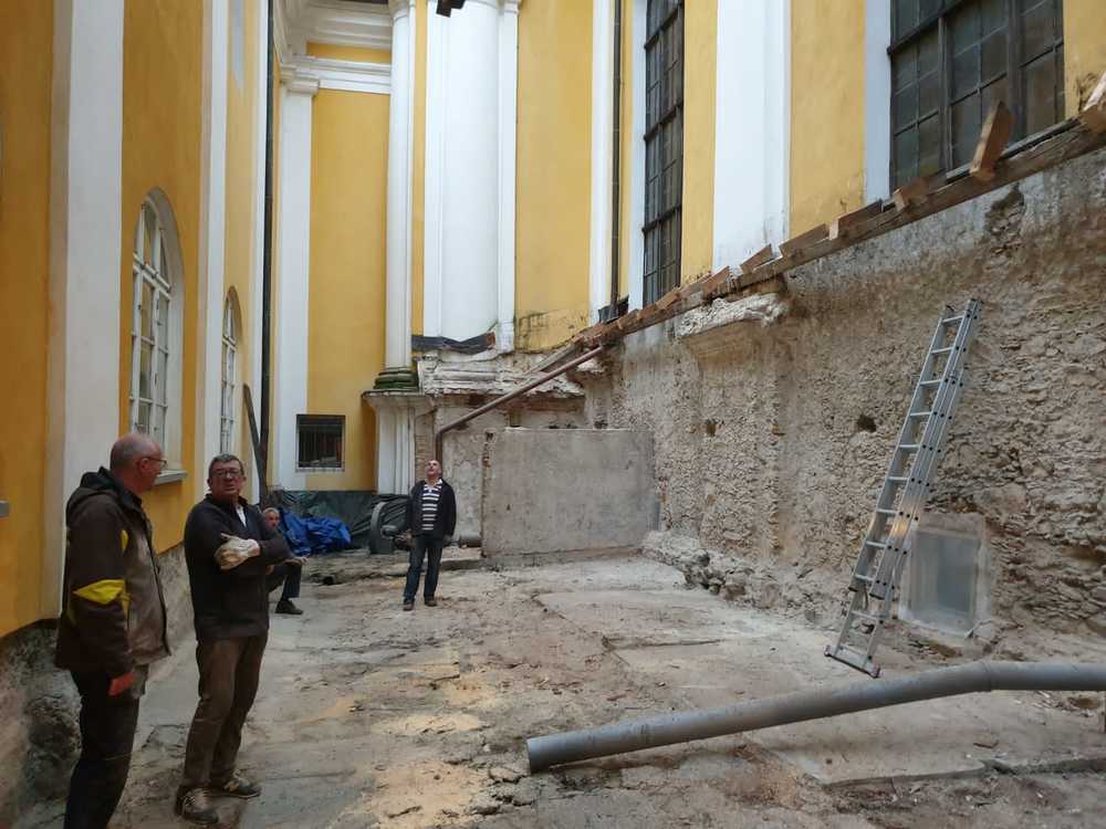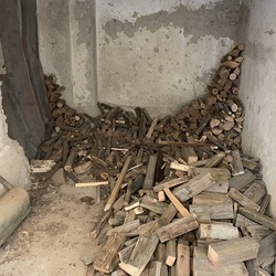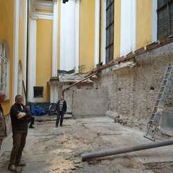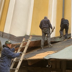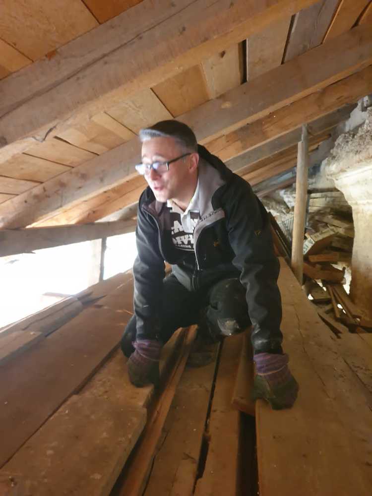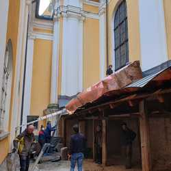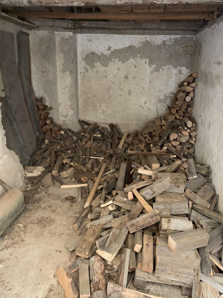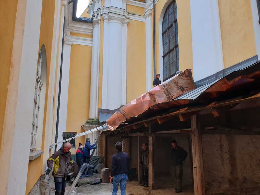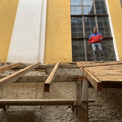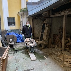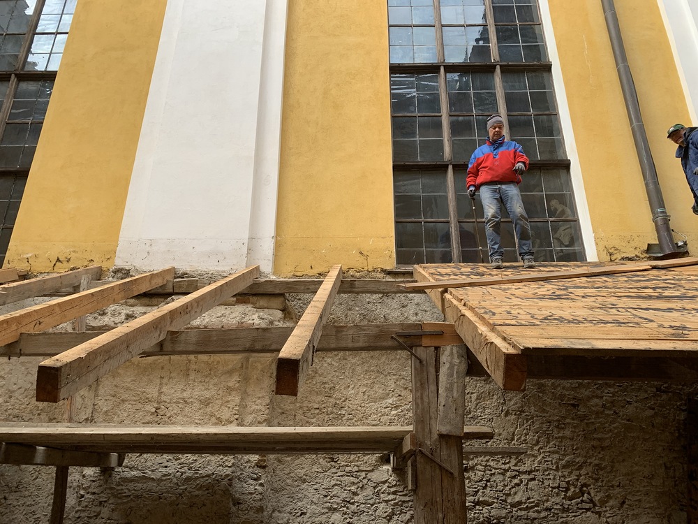 Für die Dach- und Fassadenrestaurierung mußte am Freitag, 12.03.2021 die Holzhütte im Innenhof ausgeräumt und abgetragen werden.