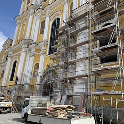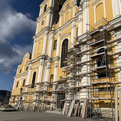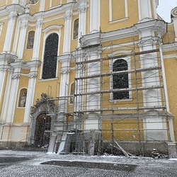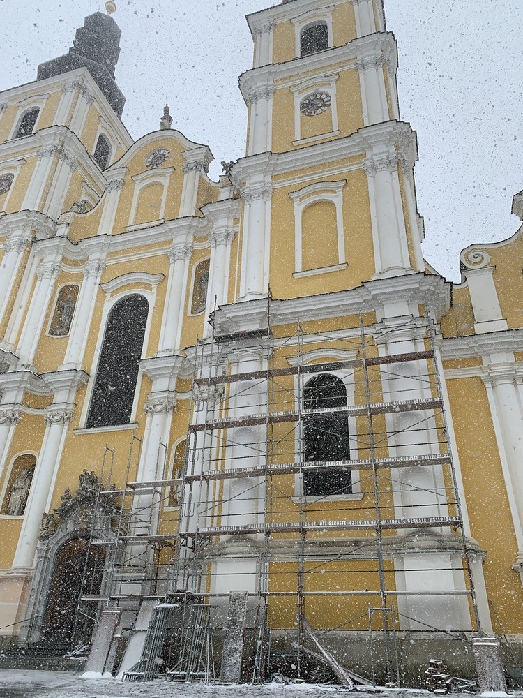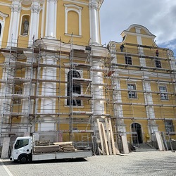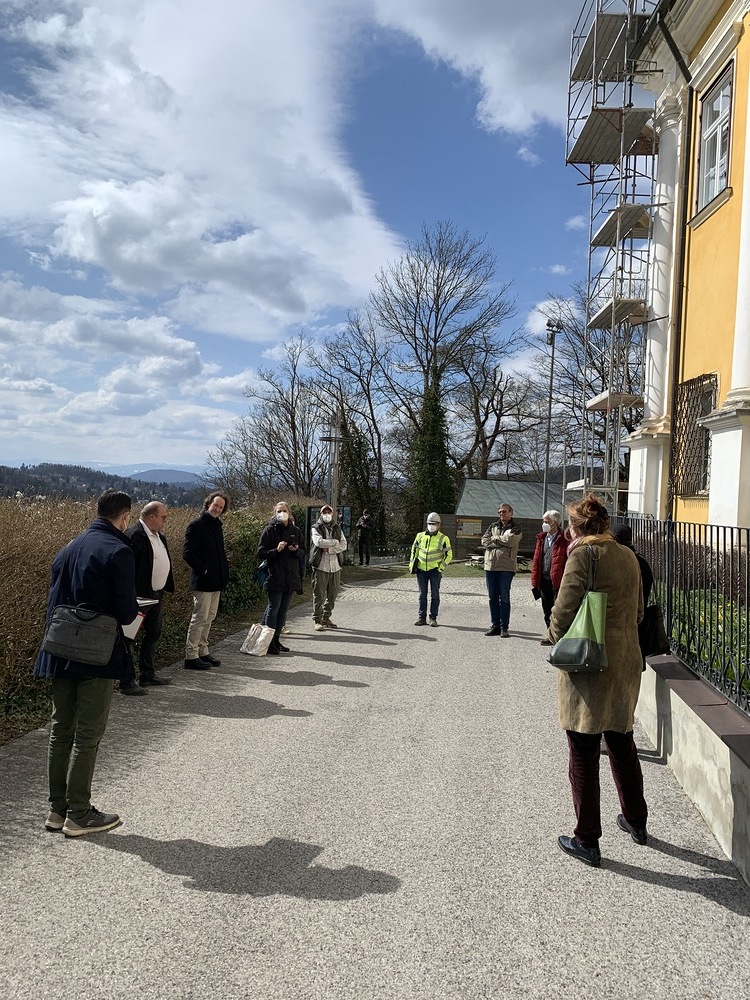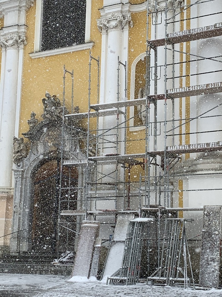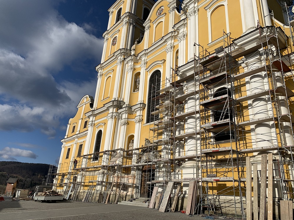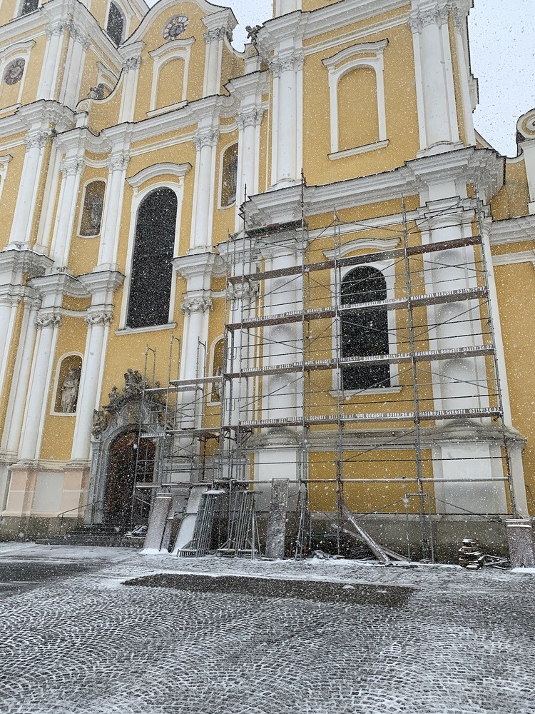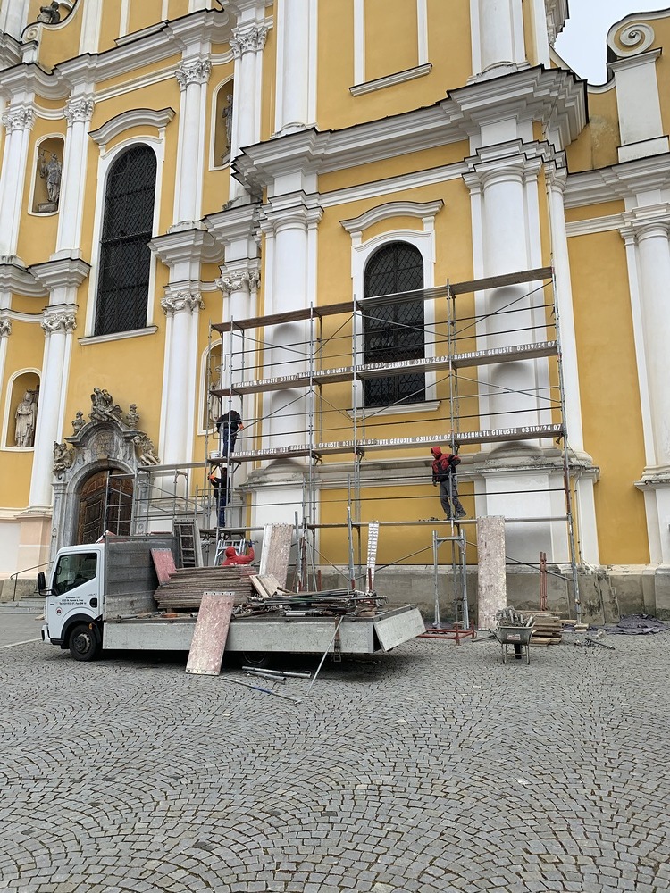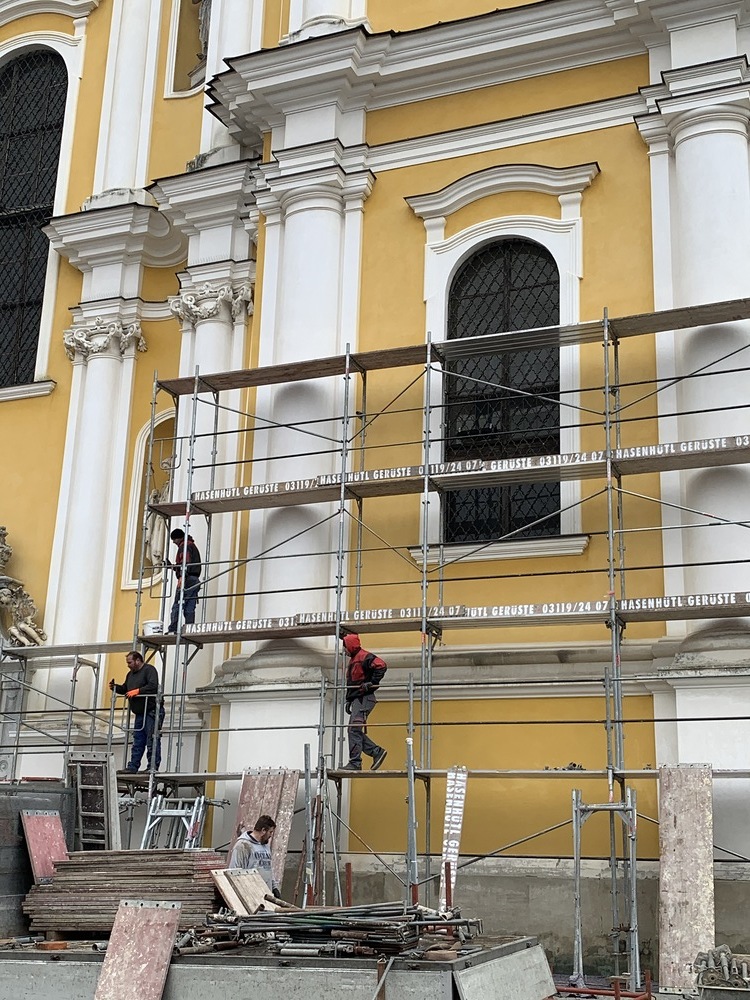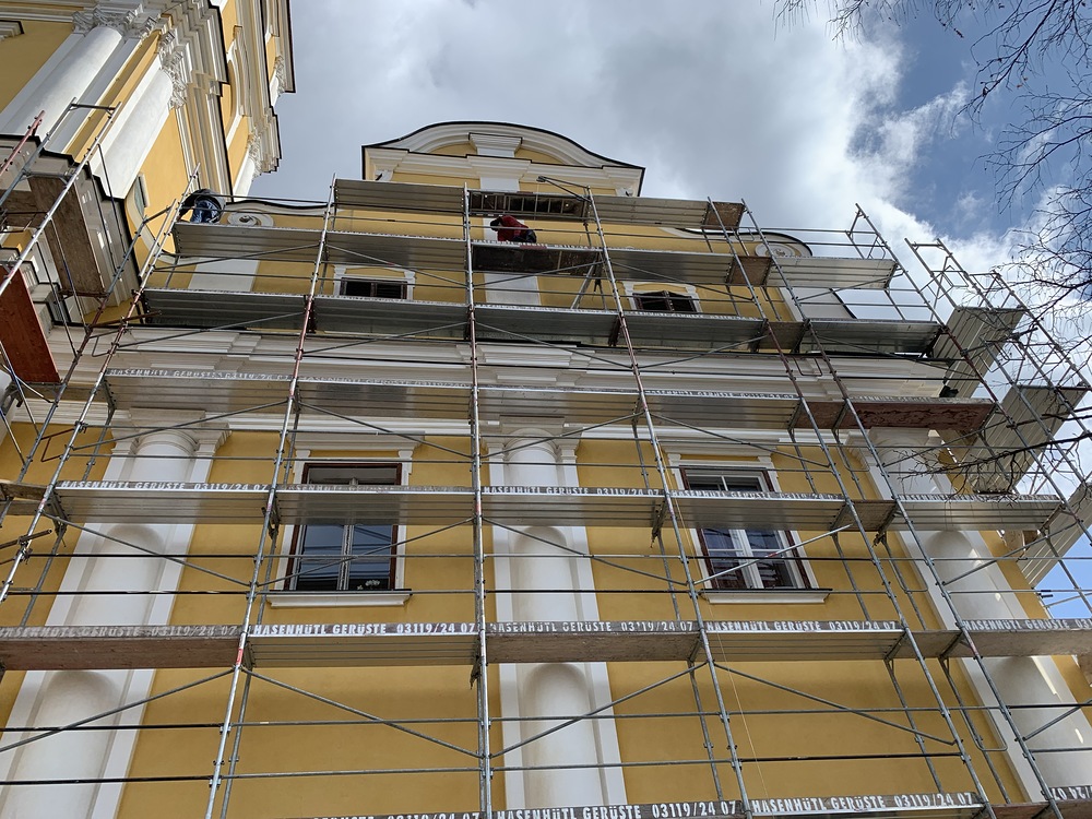 Am Samstag, 20.03.2021 wurde mit dem Einrüsten der Fassade begonnen. Neben den Bauarbeiten finden immer wieder auch Baubesprechungen mit den ausführenden Firmen und dem Bundesdenkmalamt statt.