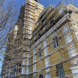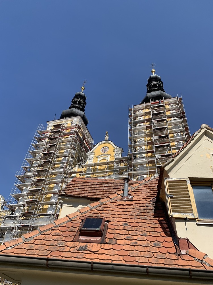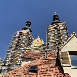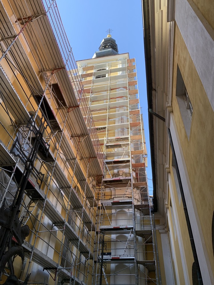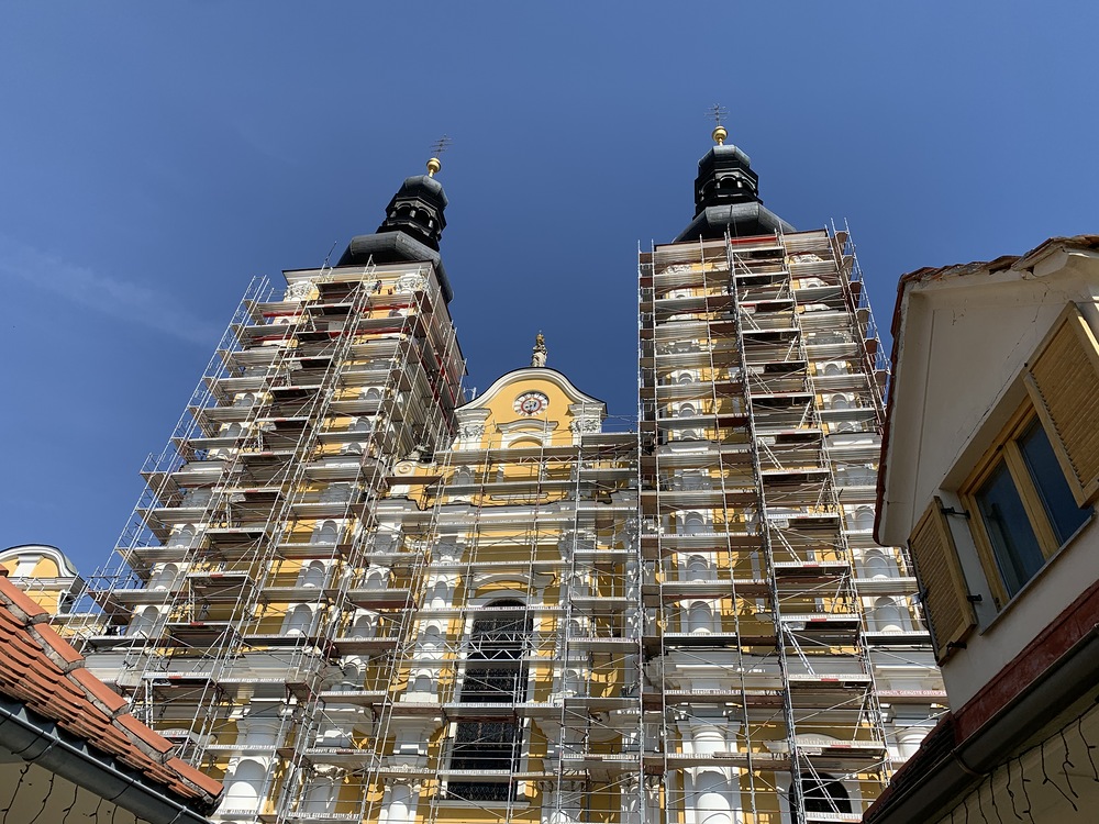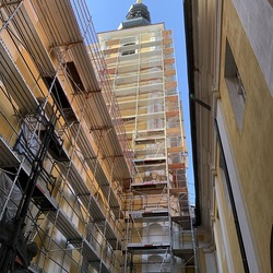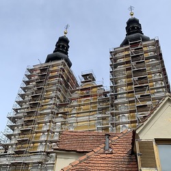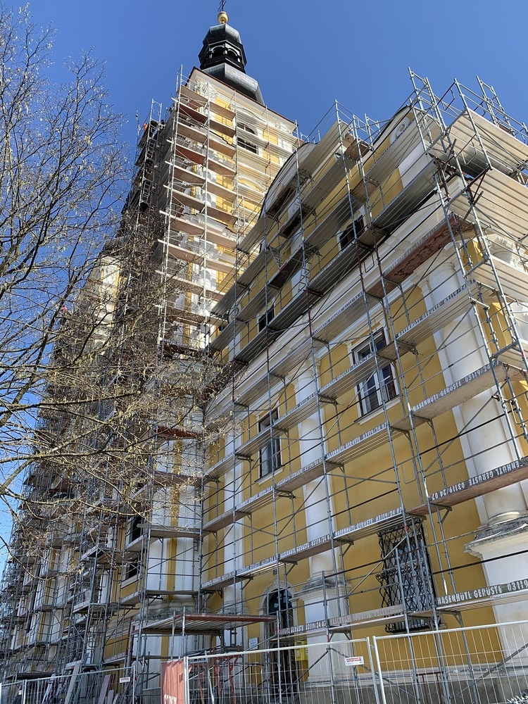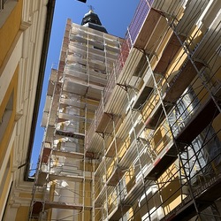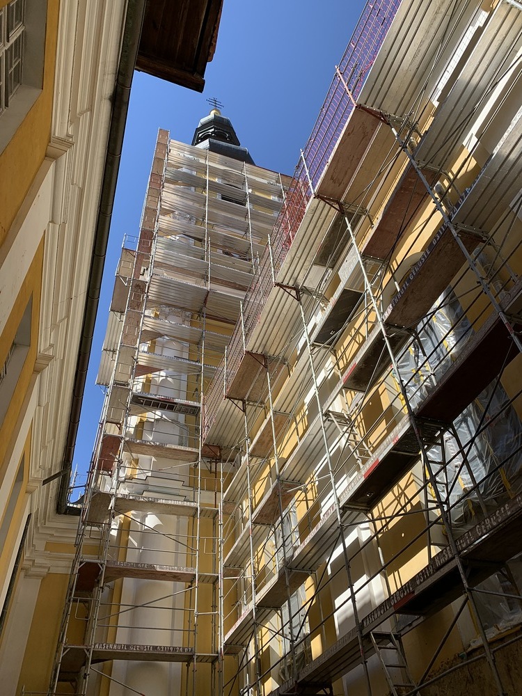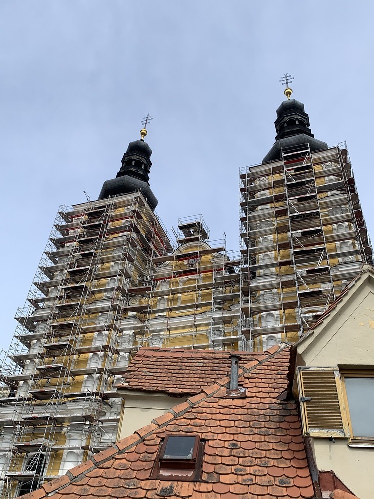 Heute Samstag, 10.04.2021 wurden die beiden Türme fertig eingerüstet. Somit ist das Einrüsten der Fassade abgeschlossen. Nun können die Sicherheitsnetze angebracht werden.