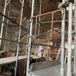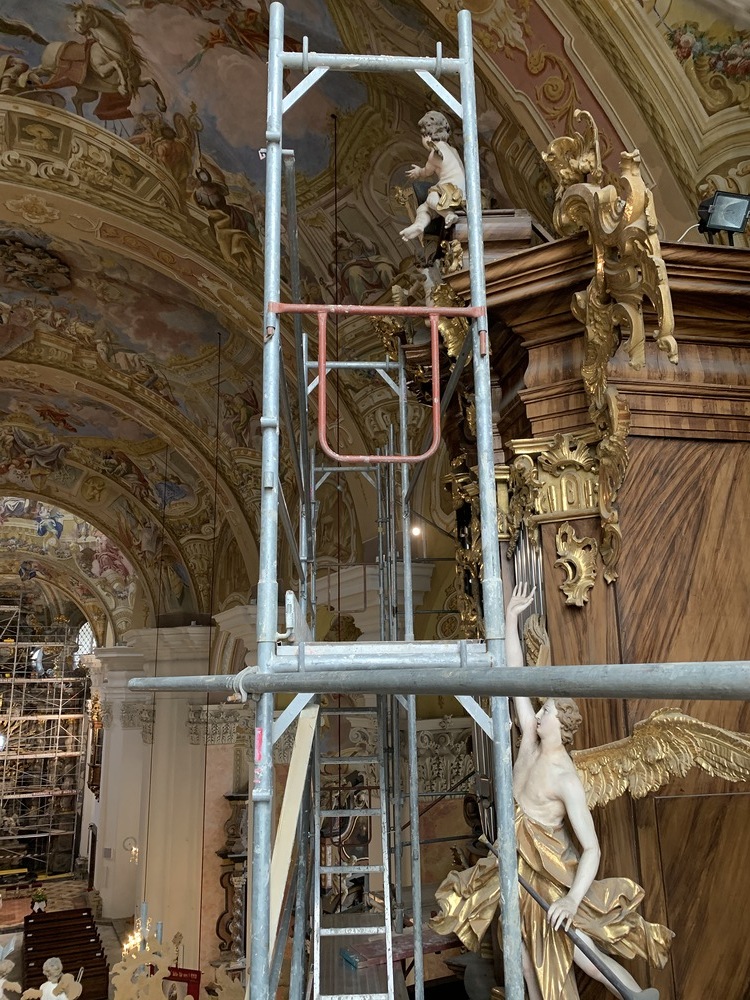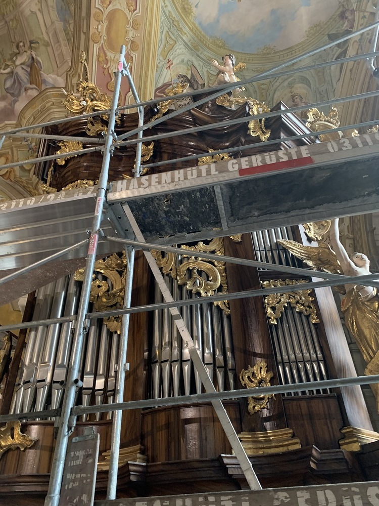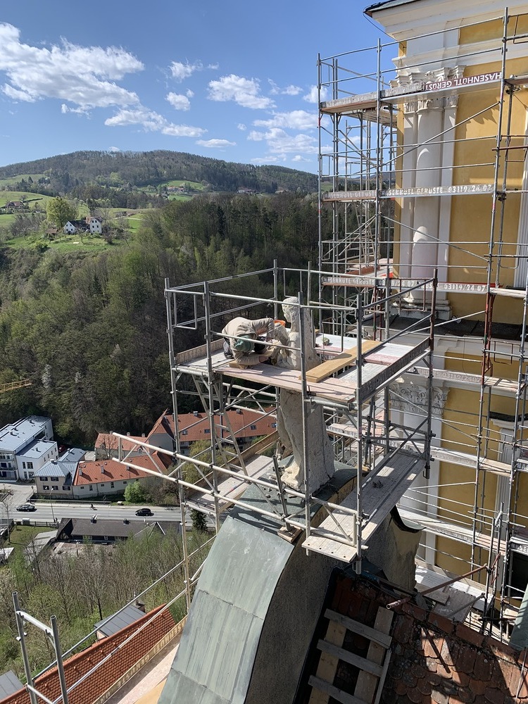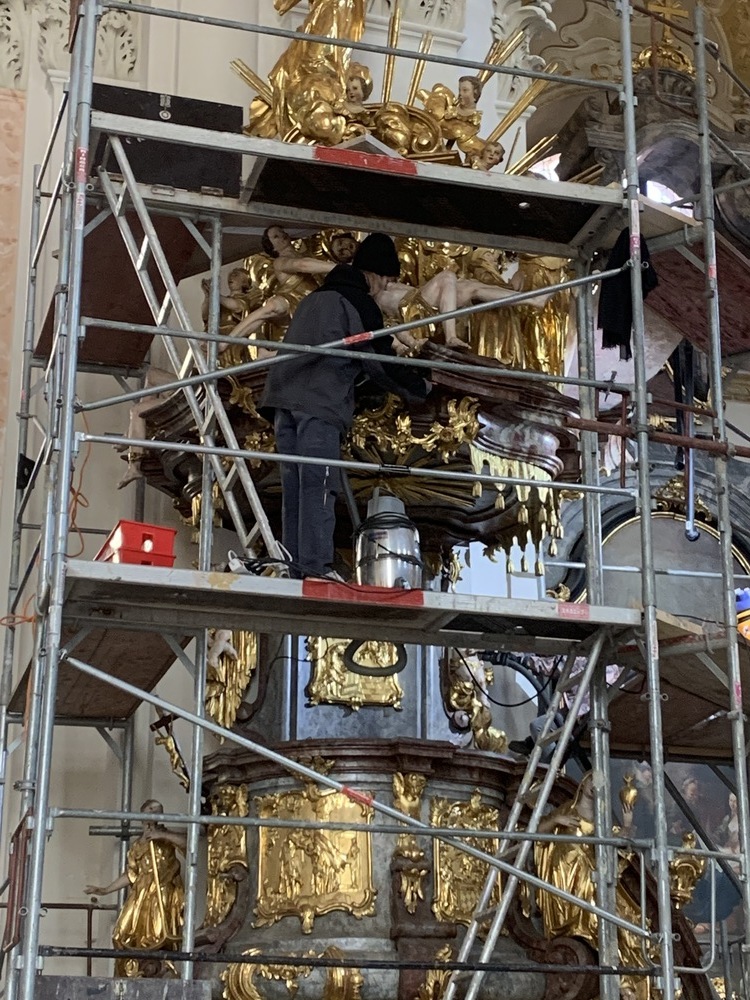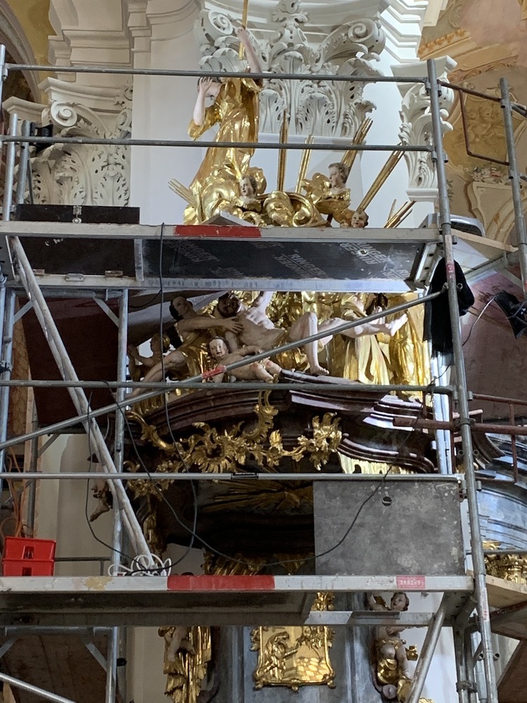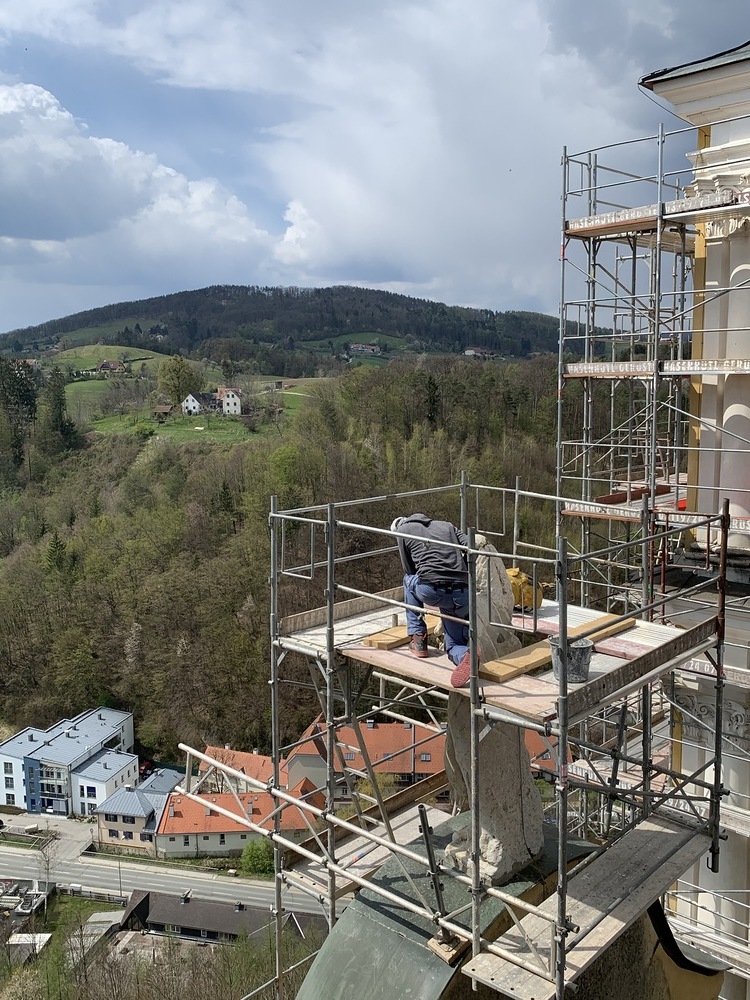 In dieser Woche waren an die 20 Personen in und um die Basilika mit Restaurierungsarbeiten beschäftigt. Gerüstaufsteller, Dachdecker, Steinmetz, Anstreicher, Restauratorinnen und Restauratoren.