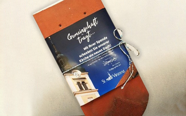 Der Pfarre fehlen aktuell noch rund 28.500 € für das neue Kirchendach. Ein Team rund um Andrea Klescher und Margit Schmiedbauer bietet derzeit alte Dachziegel als Baustein für's neue Dach an. Die Ziegel, die mit ihrem Charme und ihrer Patina als Deko-Objekt jedes Wohnzimmer aufhübschen, werden aktuell nach den Sonntagsgottesdiensten (Vinzenzkirche und 14-Nothelferkirche) angeboten. Dazu gibt es eine nachhaltige Stofftragetasche und eine Zertifikats-Banderole.
