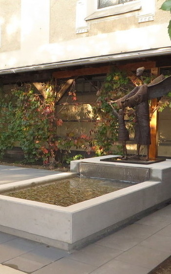 Architekt DI Andreas Gratl hat auf unseren Wunsch hin die Neuplanung des Kirchplatzes mit einem Brunnen, der von einem Schutzengel flankiert wird, durchgeführt. Der Schutzengel aus Bronze ist ein Werk des Künstlers Dr. Martin Karlik. Es ist ein Engel, der ein Kind in die Selbständigkeit begleitet.