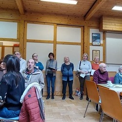 Nach dem musikalisch wunderbar umrahmten Gottesdienst begrüßten die KirchenchorsängerInnen  die BesucherInnen "mit an schean G'sang" und luden zu einem gemütlichen Beisammensein im Pfarrsaal ein.