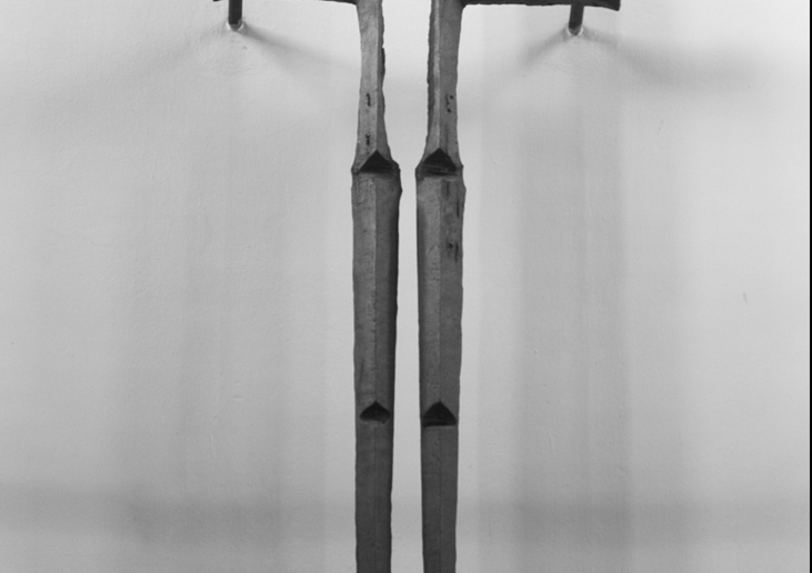 Der abstrakte Körper - der senkrechte Balken ist in zwei Stäbe geteilt - erinnert im unteren Teil an Gliedmaßen. Die Ränder des vergrößerten Leerraums im oberen Teil wirken wie aufgerissen (Leiden, Verwundung). Die Marter des Gekreuzigten wird nicht realistisch gezeigt, sondern im Zerbrechen und Auseinanderreißen angedeutet. Das Kreuz trägt keinen sichtbaren Leib, es veranlasst den Betenden, s e i n e n Christus hinzuzufügen.