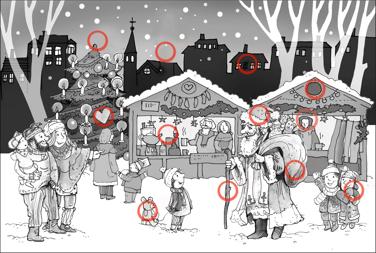In der Ausgabe vom Dezember 2023 unseres Seelsorgeraumblattes suchten wir auf der Familienseite die zwölf Fehler auf dem Adventmarkt.